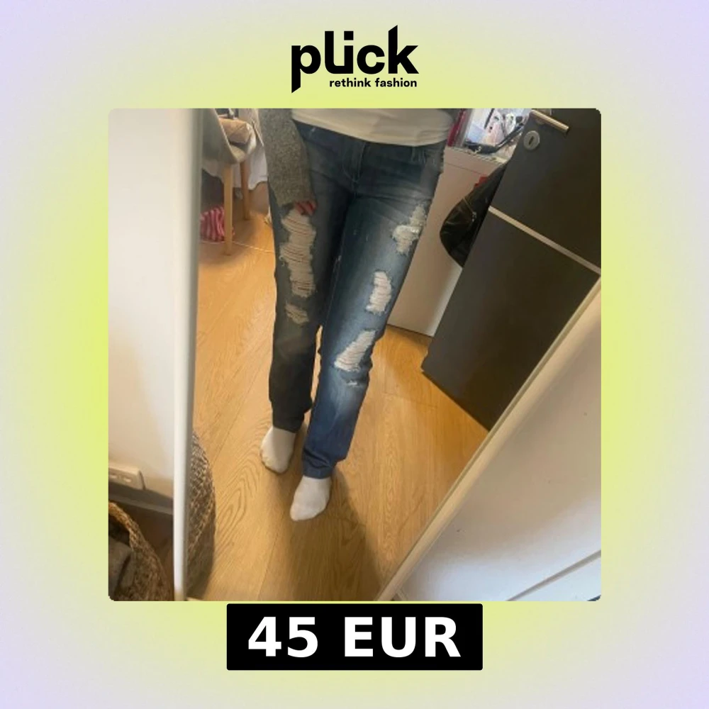 Snygga blå jeans från RL med slitna detaljer på framsidan. Det är flared/bootcut. Midjematt 39cm, innerbendslängd 88. Perfekta för en trendig/sthlm stil.
