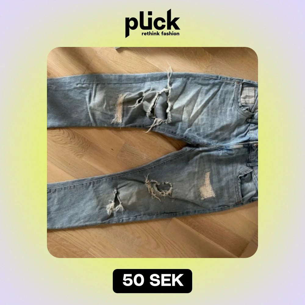 Säljer ett par blå jeans från Zara i storlek 34. De har en cool, sliten look med flera revor och slitningar på benen. Perfekta för en avslappnad och trendig stil. Passar bra till både vardag och fest! Passar s-m
