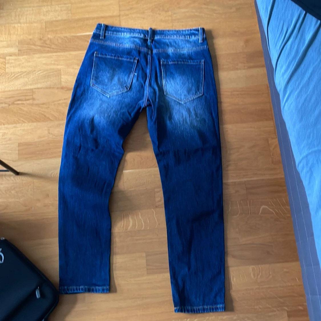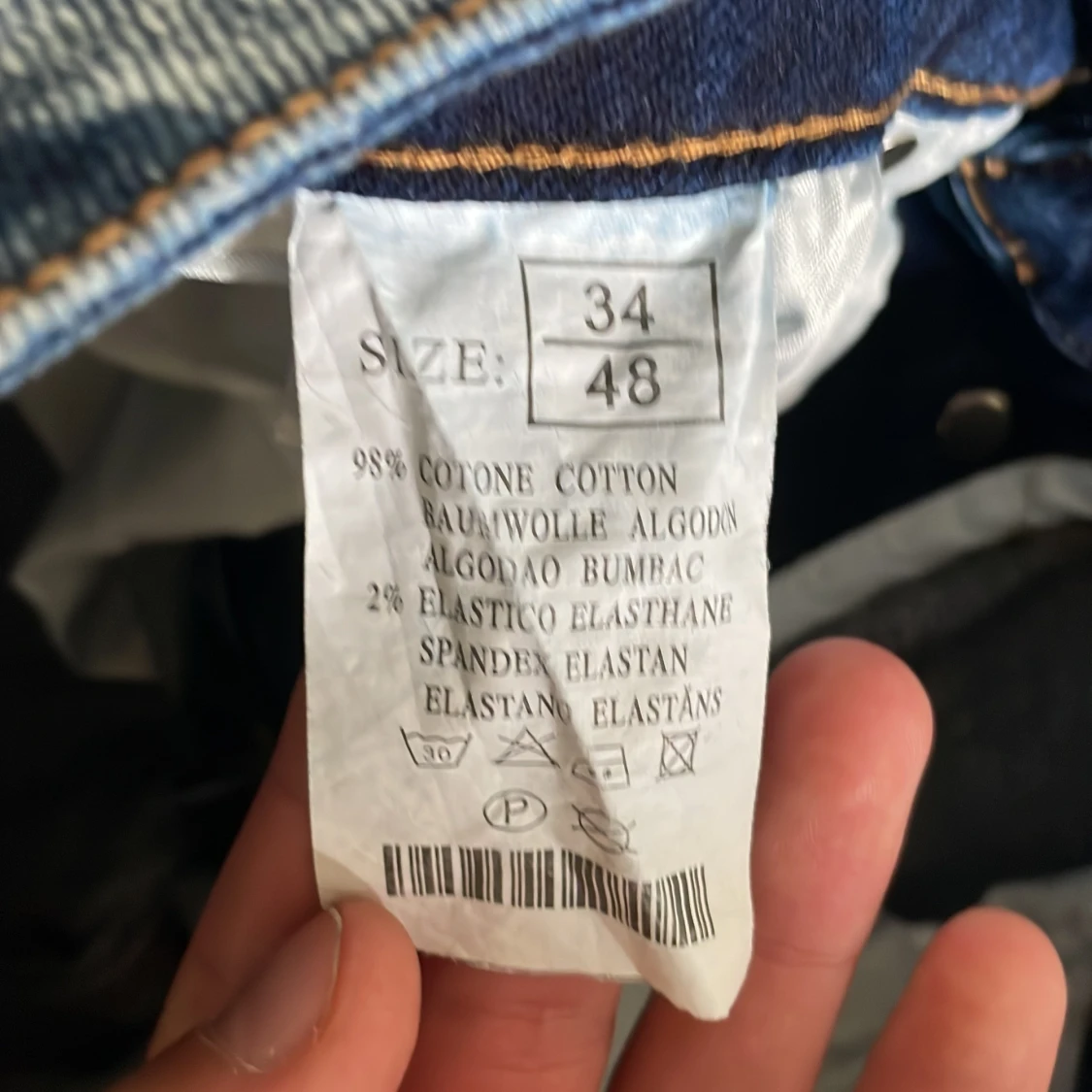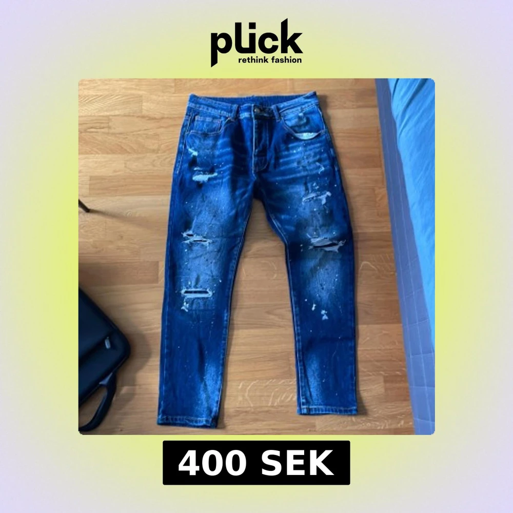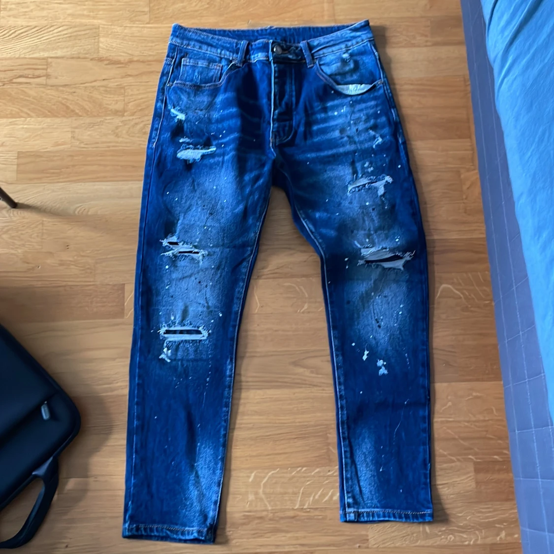 Säljer ett par blå jeans med coola slitningar och vita färgstänk på framsidan. Jeansen har klassisk femficksdesign och rak passform. Perfekta för dig som gillar en edgy och avslappnad stil. Storlek 34,48, skriv vid funderingar Pris kan diskuteras