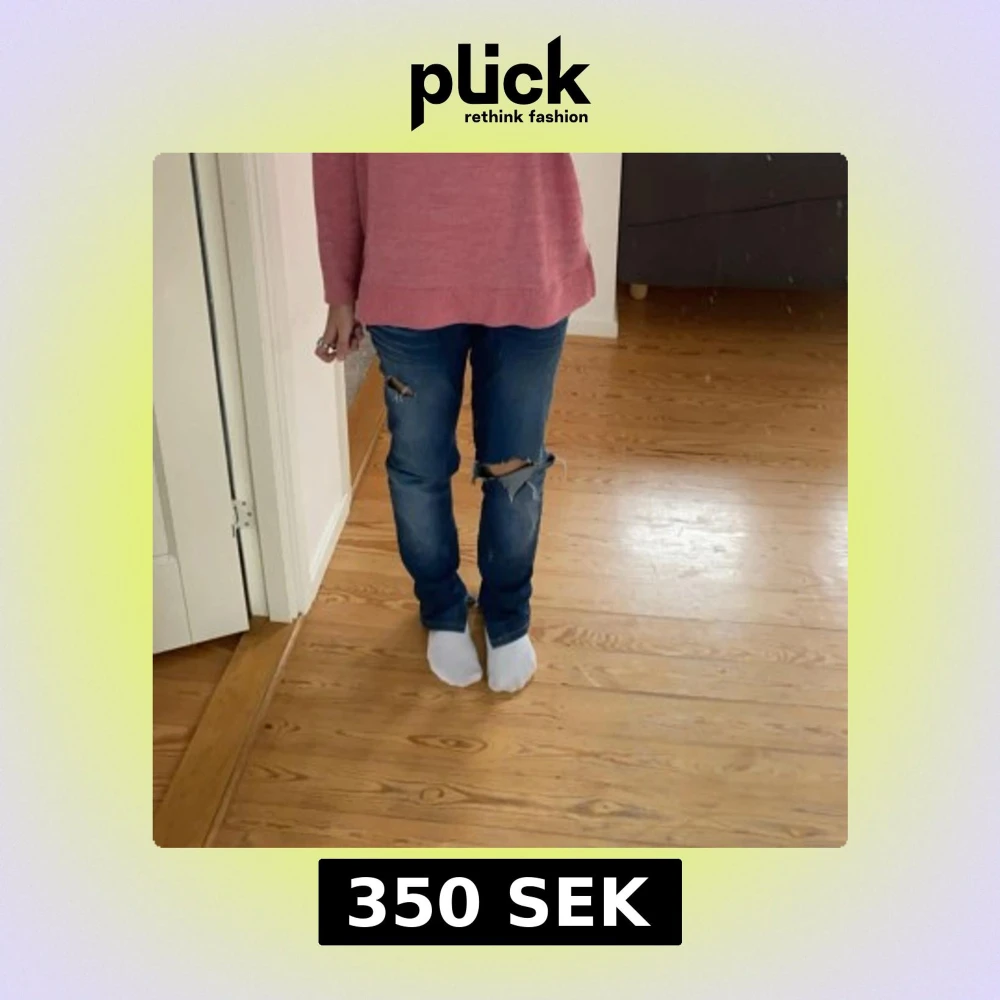 Säljer ett par blå jeans med slitningar och stora hål på båda benen. Jeansen har en rak passform och klassisk femficksdesign. Perfekta för en avslappnad och trendig look.