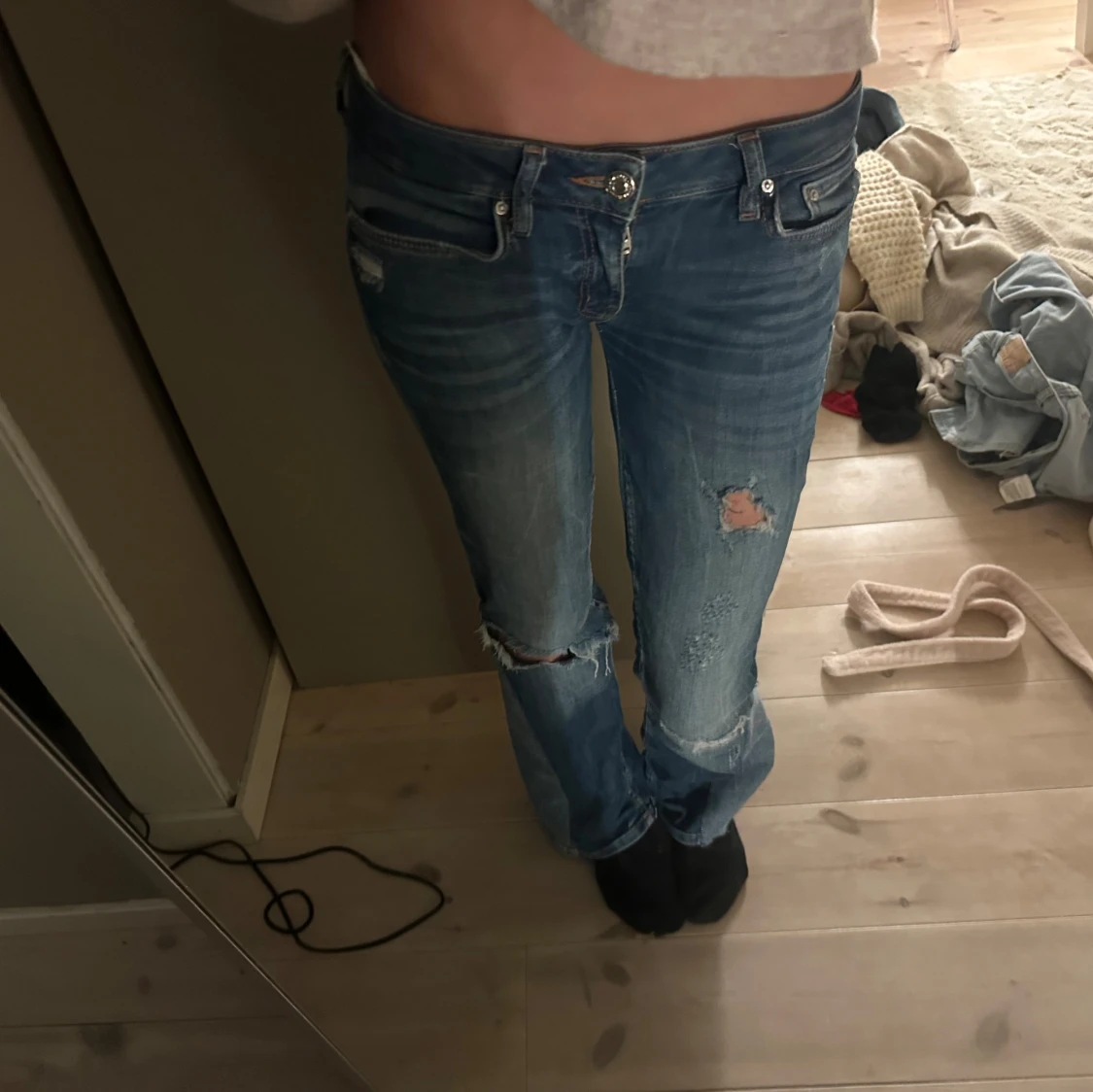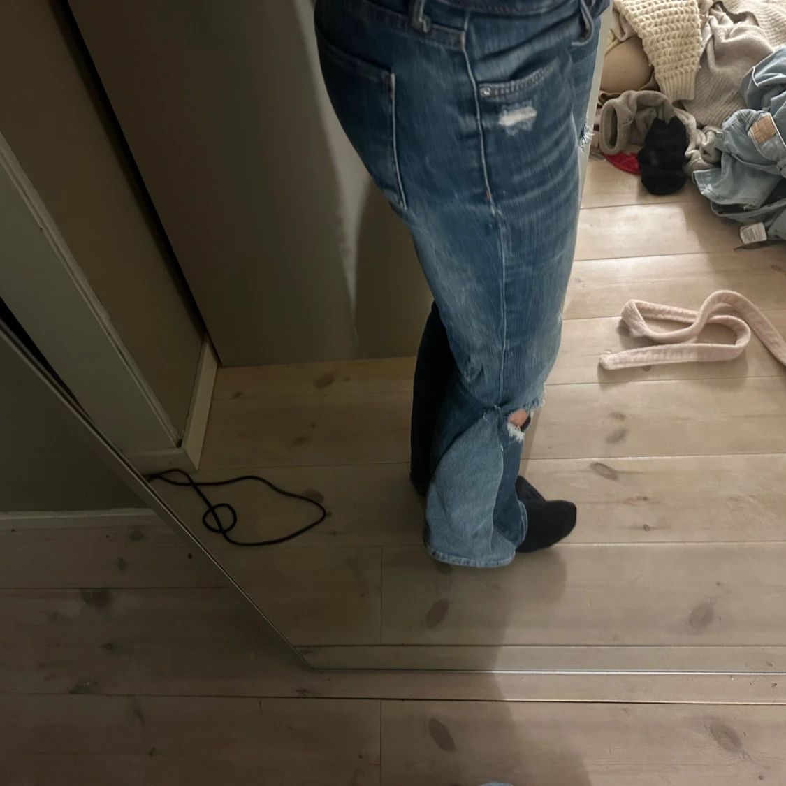 Säljer ett par blå jeans med slitningar och hål på knäna. De är sydda till bootcut och lågmidjade! AS snygga😍😍