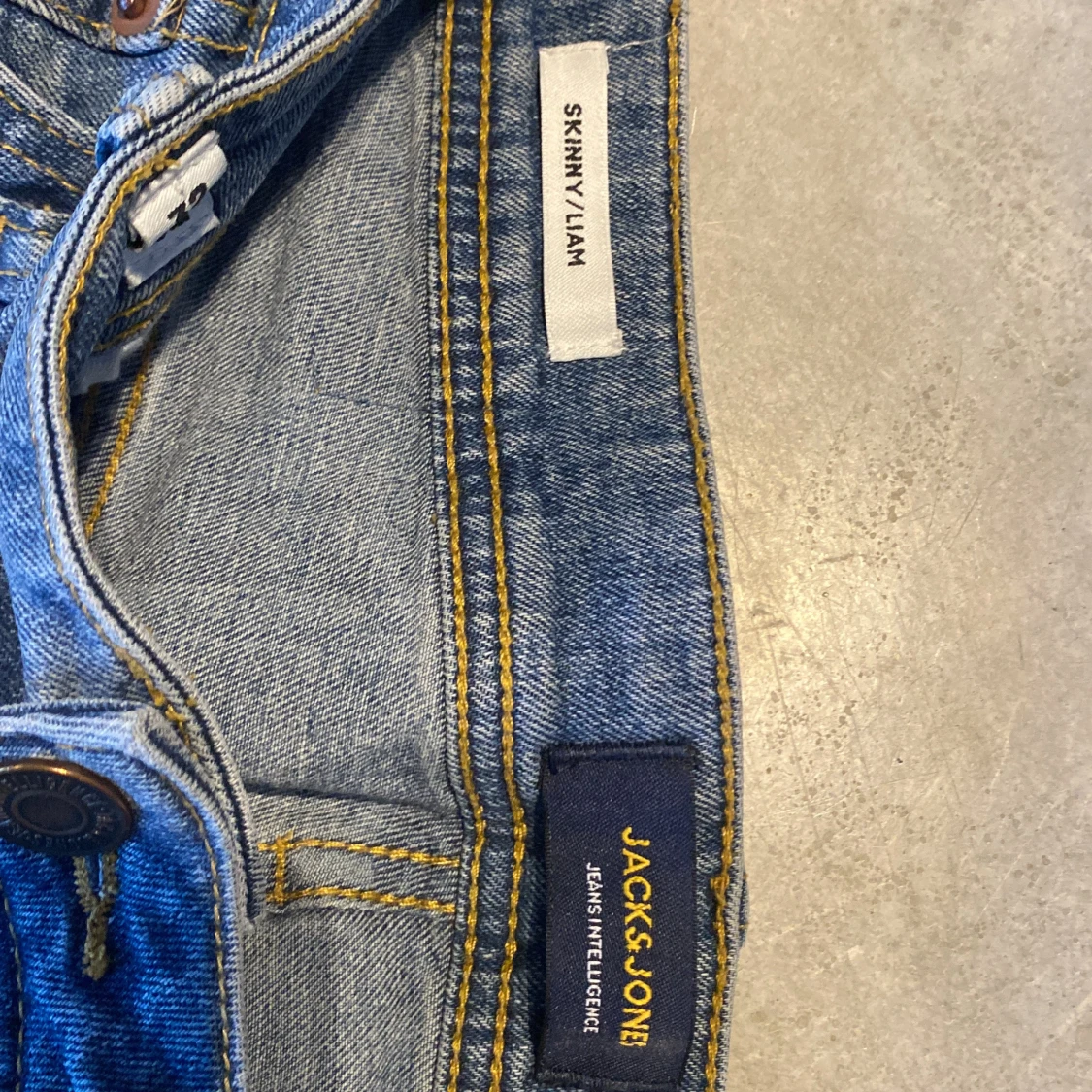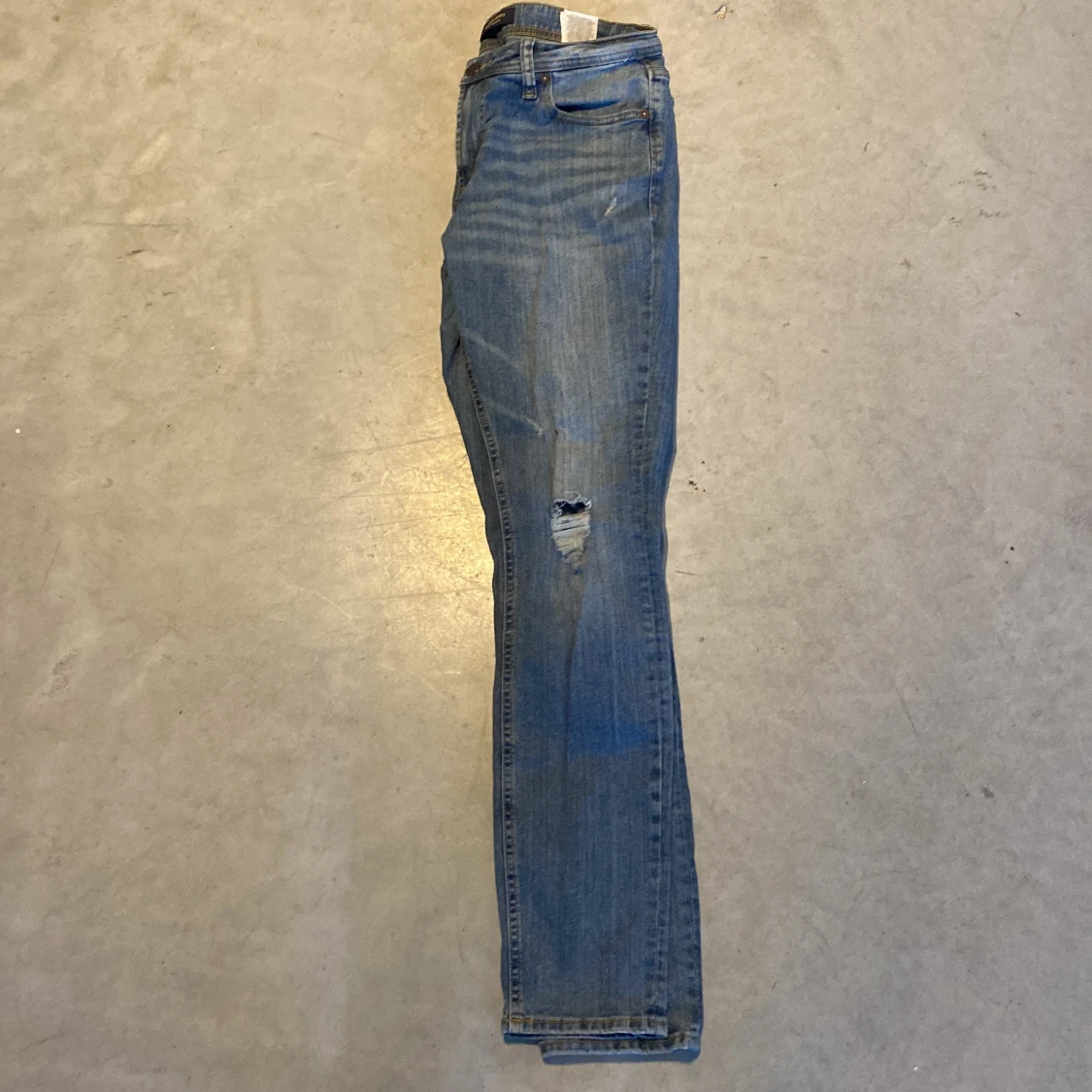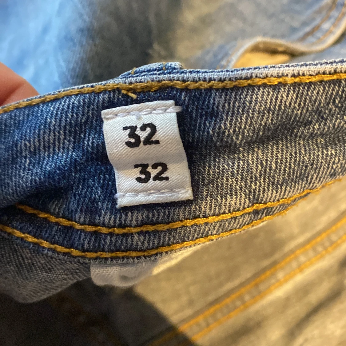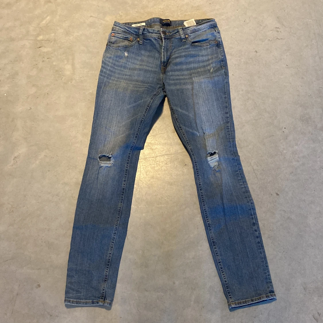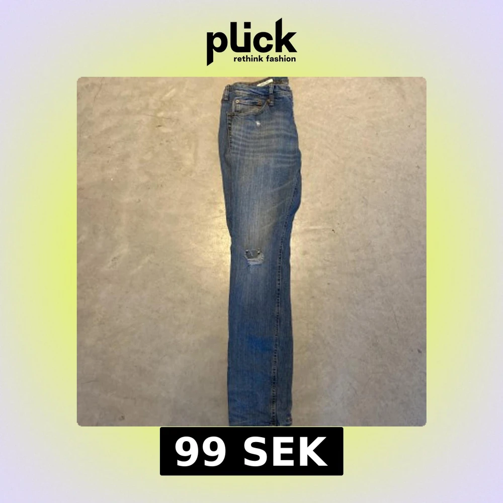 Säljer ett par klassiska blå jeans med raka ben och slitningar på båda knäna. Jeansen har normal passform och är tillverkade i denim med synliga sömmar. Perfekta för en avslappnad stil.