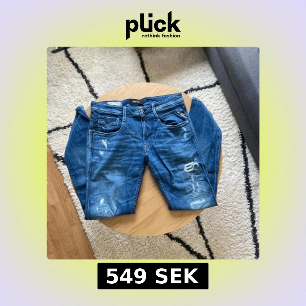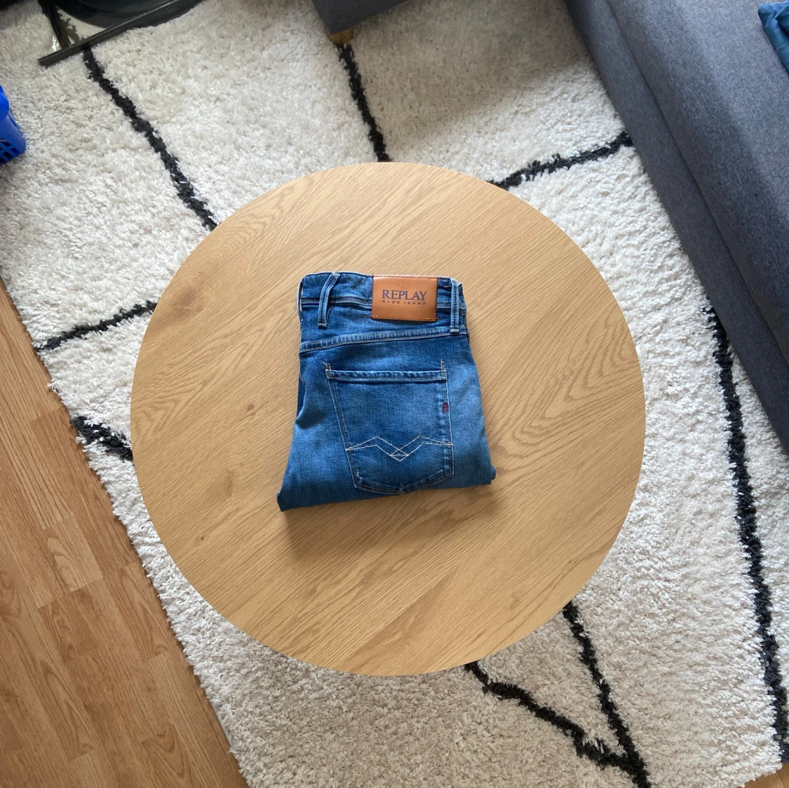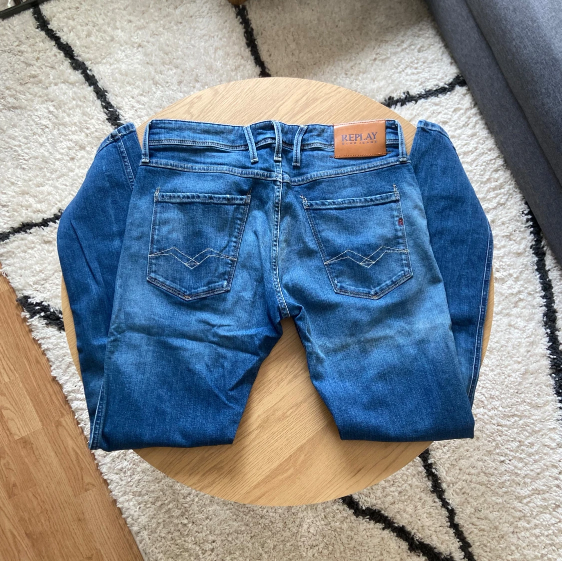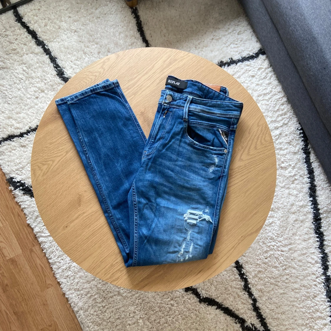 Hej👋 Säljer ett par blå jeans från Replay med slitningar och lätt tvättad look👖 Klassisk femficksmodell med knappgylf och läderpatch bak i midjan. Jeansen har raka ben och normal passform🧷 Jeansen har Anbass modell! Storleken på jeansen är W33 L34📐 Kom privat för mått📏 Priset är INTE ristat i sten så kom gärna med prisförslag💵 Vid frågor: Meddela oss!📩.
