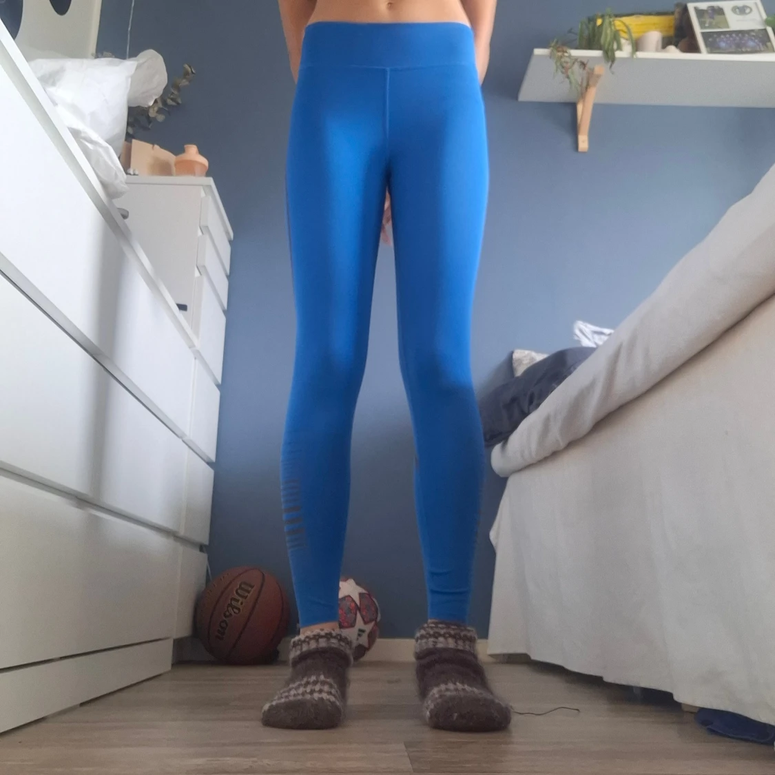 Säljer ett par blå tights från Better Bodies med gråa detaljer och logga längs benet. De har hög midja och sitter tight, perfekta för gymmet eller annan träning. Materialet är stretchigt syntet som andas och ger bra rörelsefrihet.