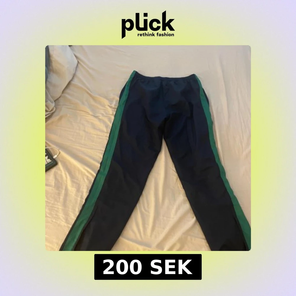 Snygga blå träningsbyxor från Lacoste med gröna ränder längs sidorna. Byxorna har en elastisk midja och en dragkedja vid ben änden. Perfekta för en sportig och klassisk look. Nypris ~1200
