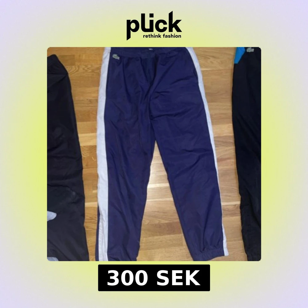 Snygga blå träningsbyxor från Lacoste med vita sidopaneler och elastisk midja med snörning. Perfekta för sportiga aktiviteter eller en avslappnad stil. Den ikoniska Lacoste-loggan pryder framsidan.