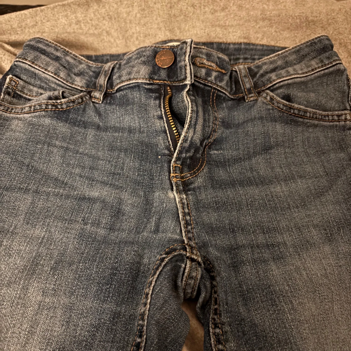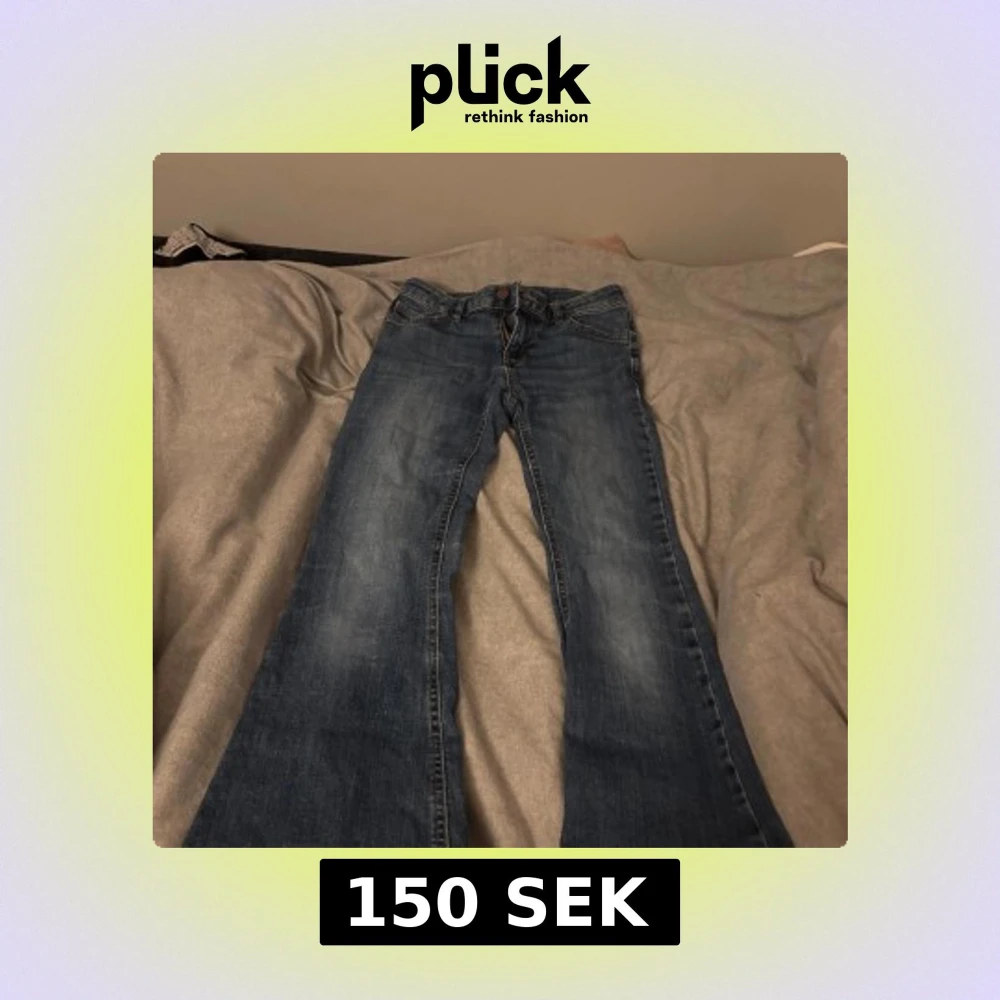Snygga blå utsvängda jeans med dragkedja och knapp framtill. Perfekta för en avslappnad stil med en klassisk jeanslook. De har en lätt tvättad effekt som ger en cool vintagekänsla.🩷🥰