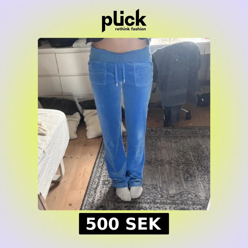 Säljer ett par blåa velourbyxor från Juicy Couture i stl xxs. Byxorna har snörning i midjan, raka ben och stora fickor både fram och bak. Perfekta för en chill och trendig look. det ena snörstoppet har tyvärr trillat av men annars är de som nya!💞💞