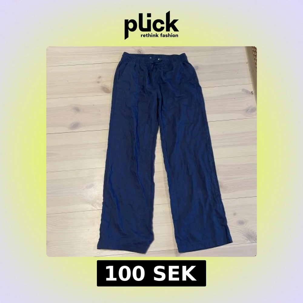 Säljer ett par blå byxor med resår i midjan och en bakficka. Byxorna har en loose passform och raka, vida ben. Perfekta för en avslappnad stil och sköna att bära under varmare dagar.
