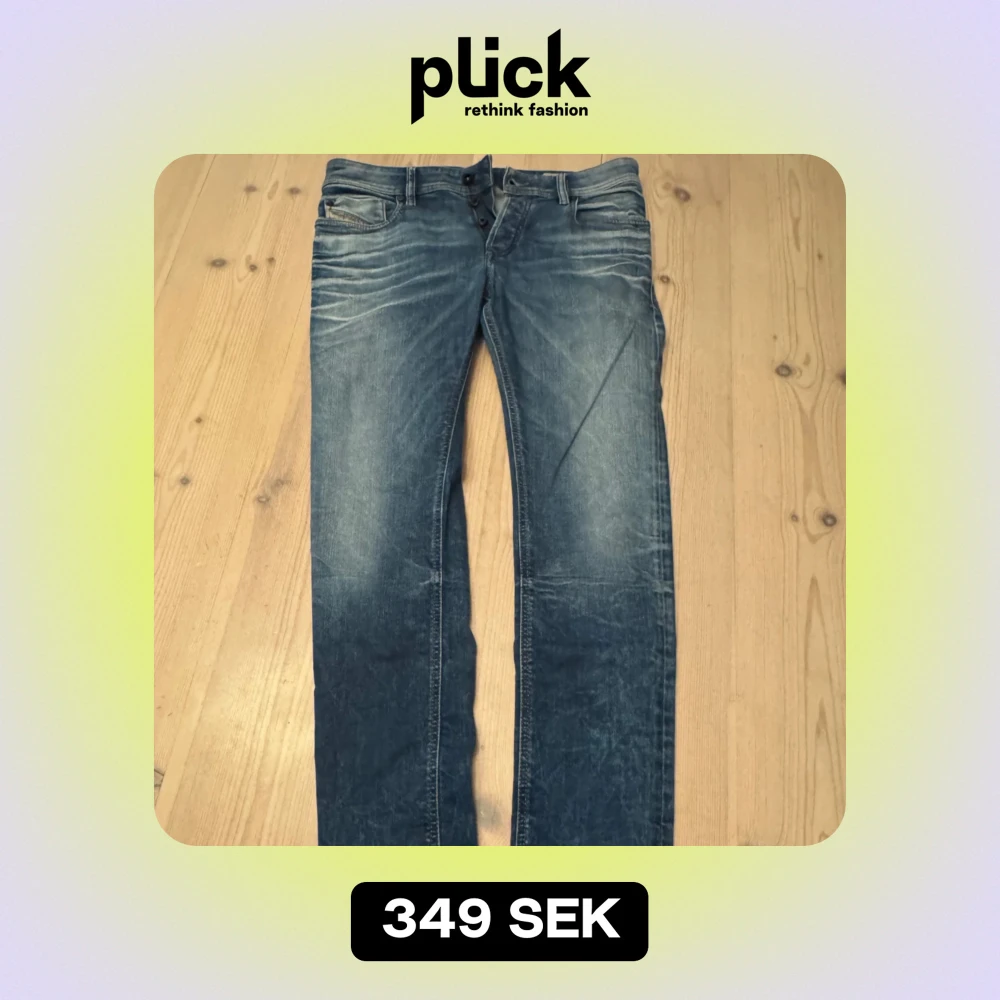 Säljer ett par snygga blå washed jeans i gott skick. Passformen är slim och de är i storlek 32.