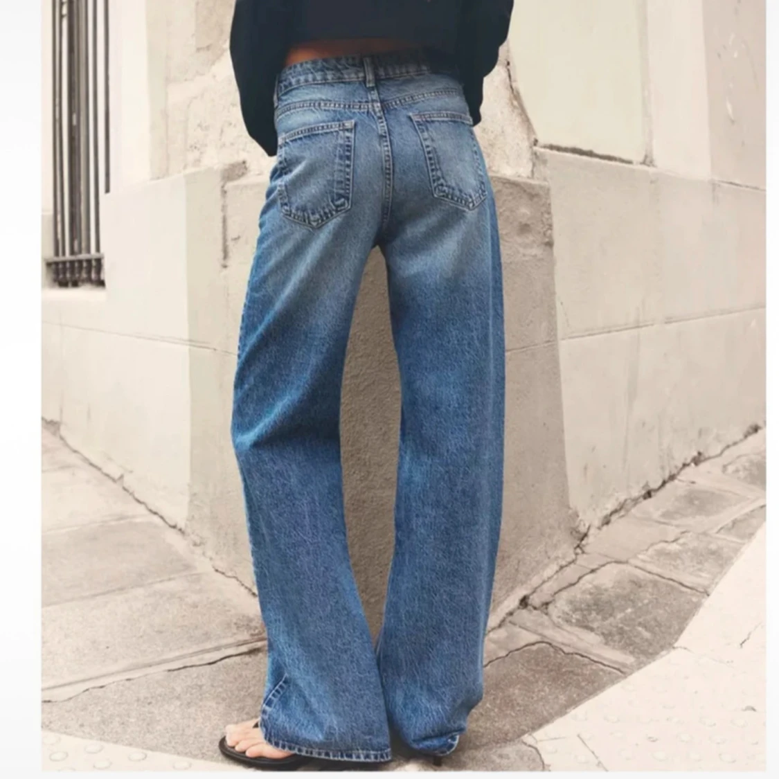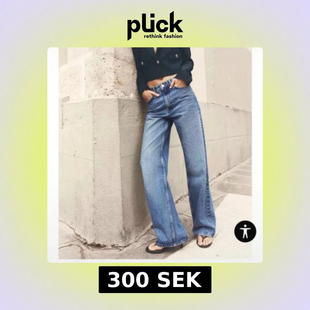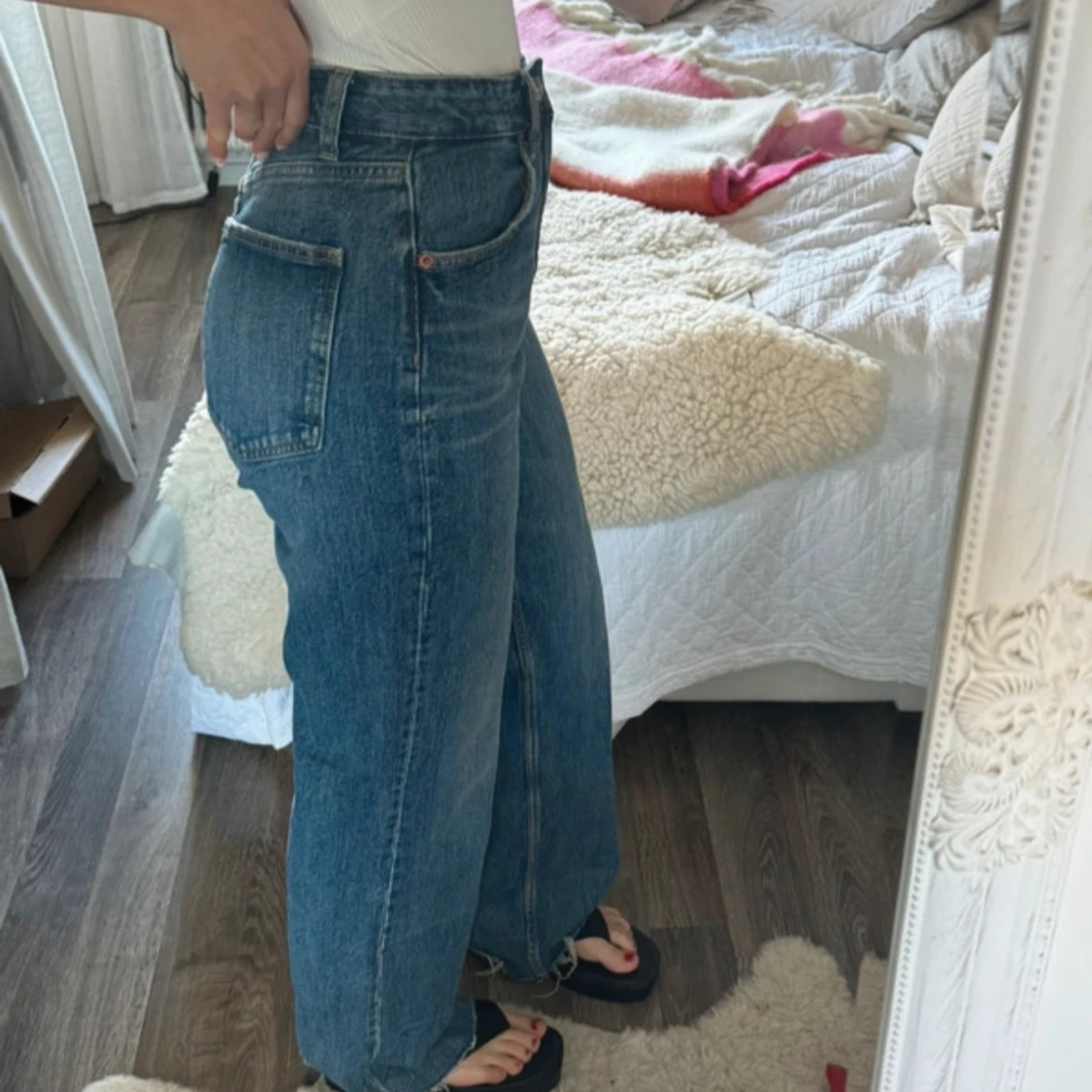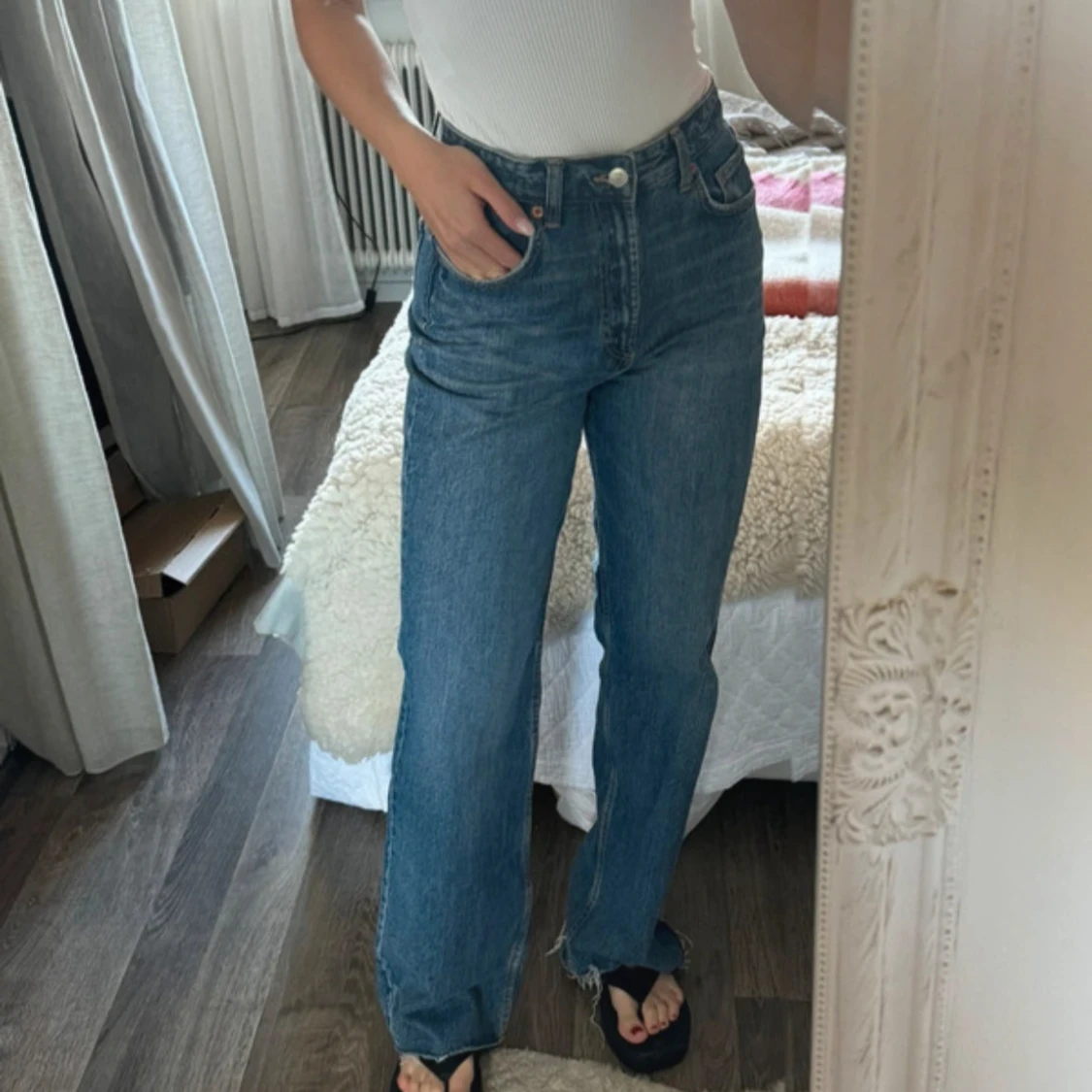 Säljer ett par blå jeans med hög midja och breda ben. Modellen har klassiska fickor, raka sömmar och en snygg vintage tvätt. Jeansen är tillverkade i robust denim och har en loose passform som ger en chill vibe.