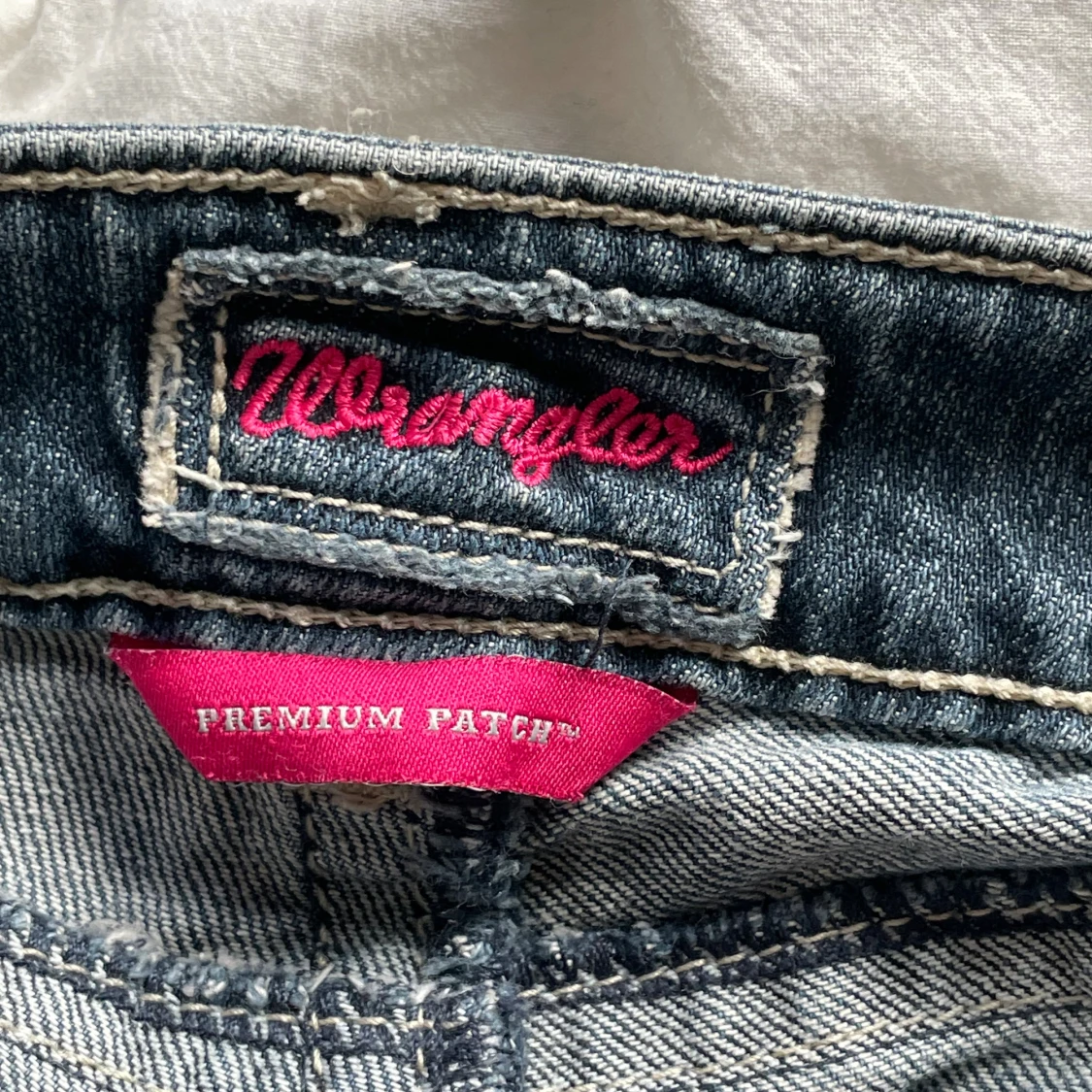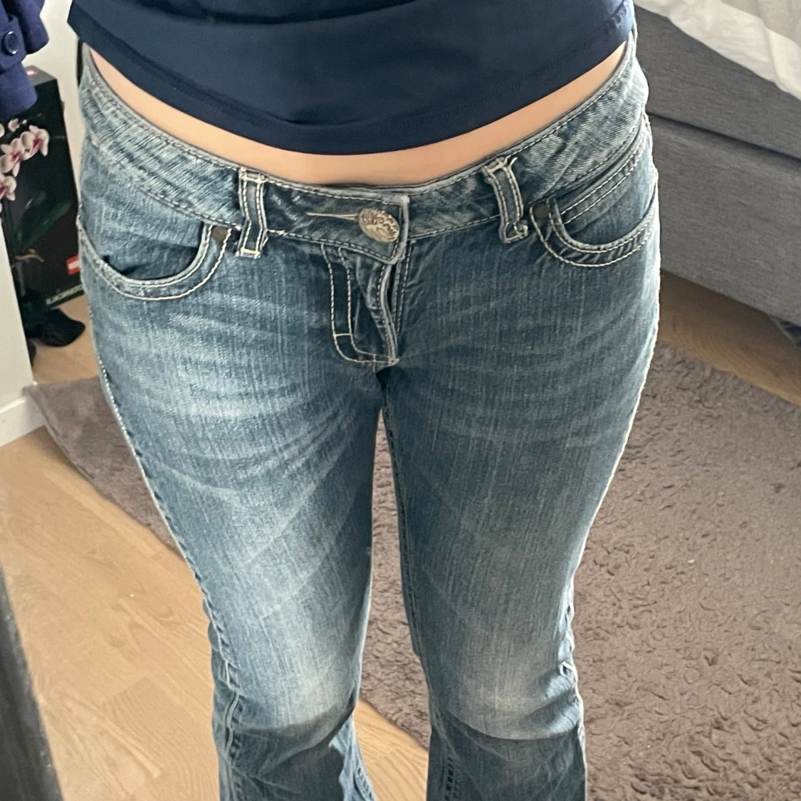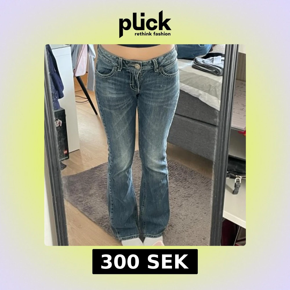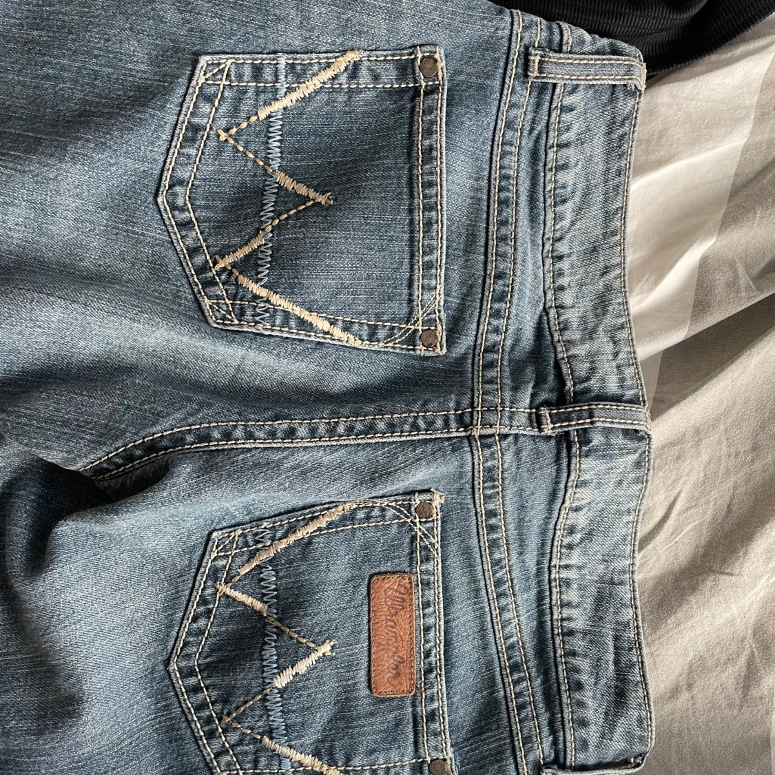 Låga jeans från wrangler med snygga detaljer bak! Står ej storlek men passar mig som har S och är 171 cm! Skit snygga jeans men kommer tyvärr inte till användning!