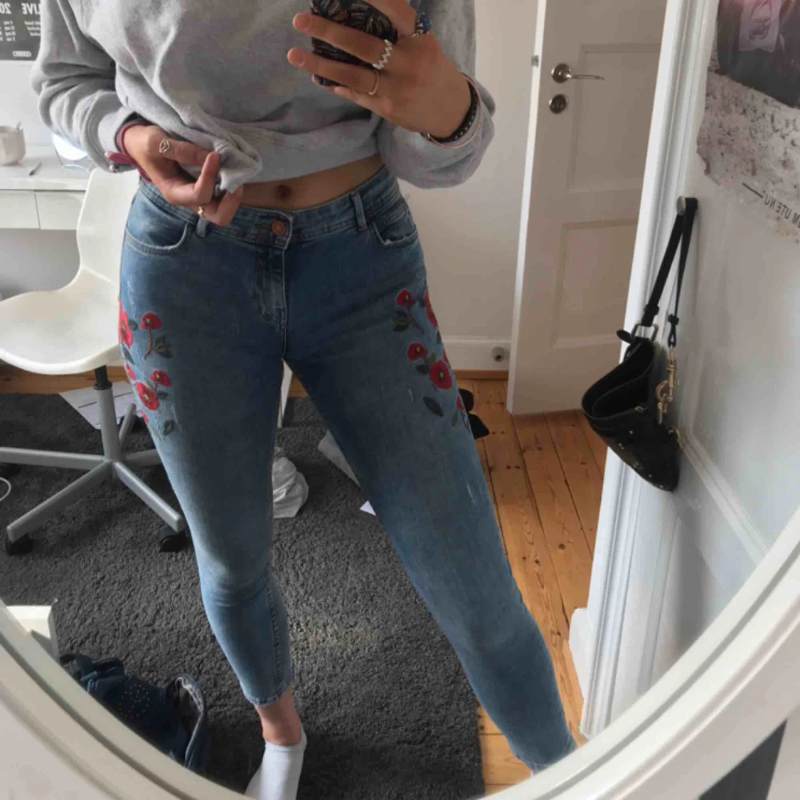Supervåriga jeans från Zara. De är ljusblå med röda broderade blommor på vardera sida om höften:) Även lite slitna i den ljusblå färgen!