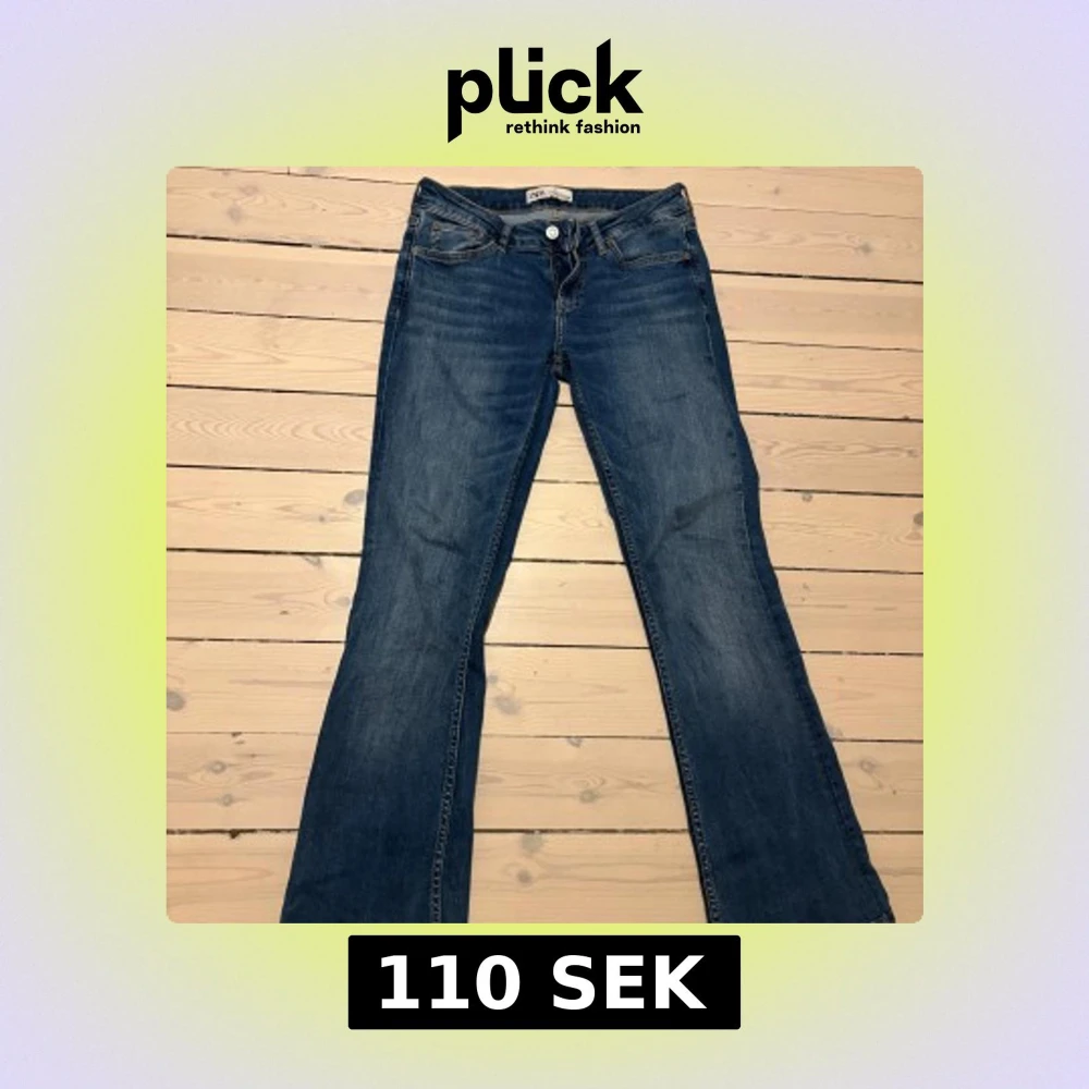 Snygga mörkblåa bootcut jeans från Zara med en klassisk femficksdesign. De är low-mid waist. Går att styla med allt. Säljer då de tyvärr är lite stora (det är min kompis på bilden).