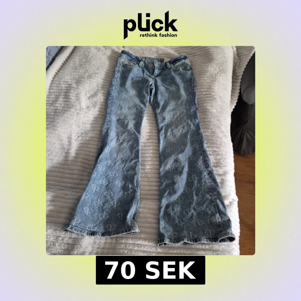 Snygga ljusblå bootcut jeans från H&M Divided med all-over tryckt mönster. Jeansen har klassiska fickor fram och bak, samt coola detaljer med knappar på bakfickorna. Perfekta för dig som vill sticka ut med en unik denimstil.