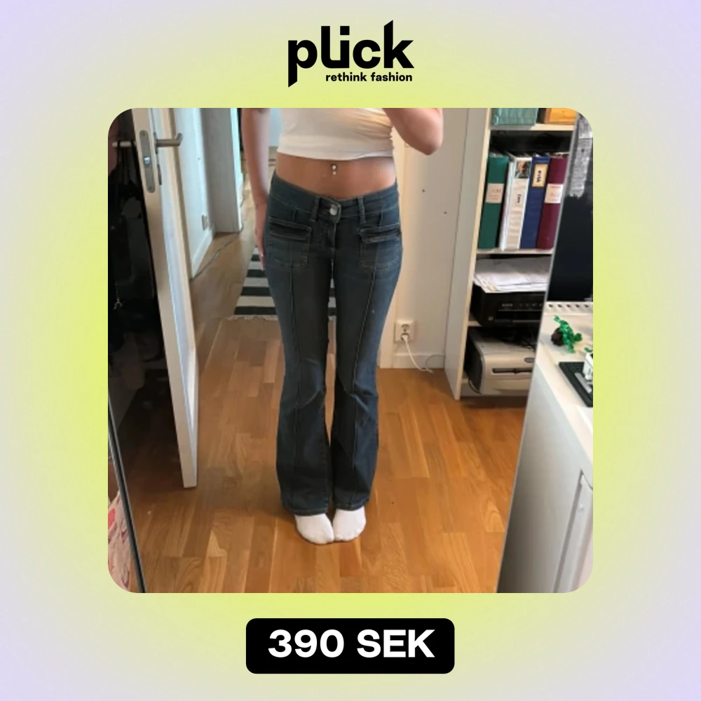Blåa low waist jeans med fickor fram. Säljer dessa jeans för att de tyvärr blivit lite för små för mig💕 Jeansen är från Nelly i Storlek 34/S