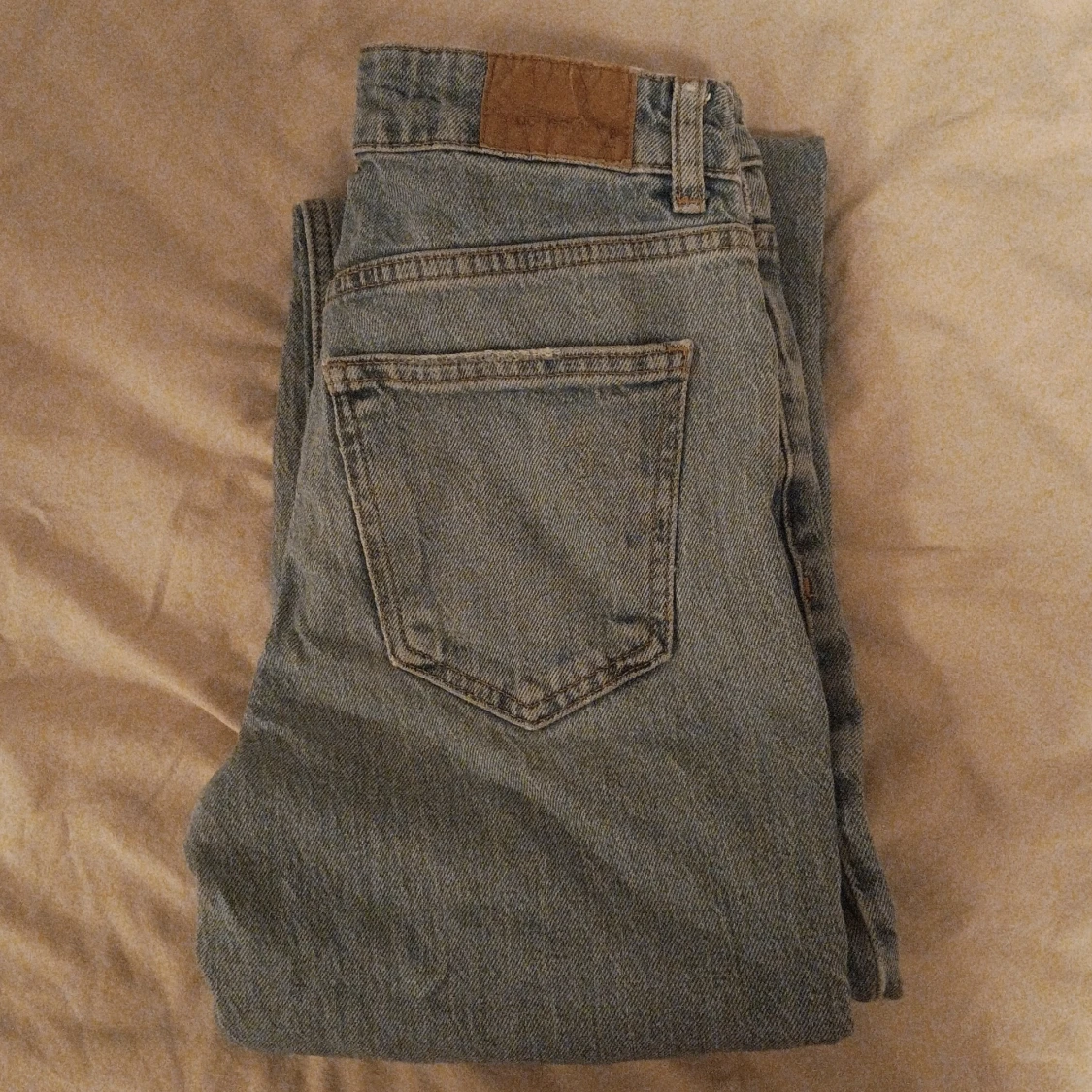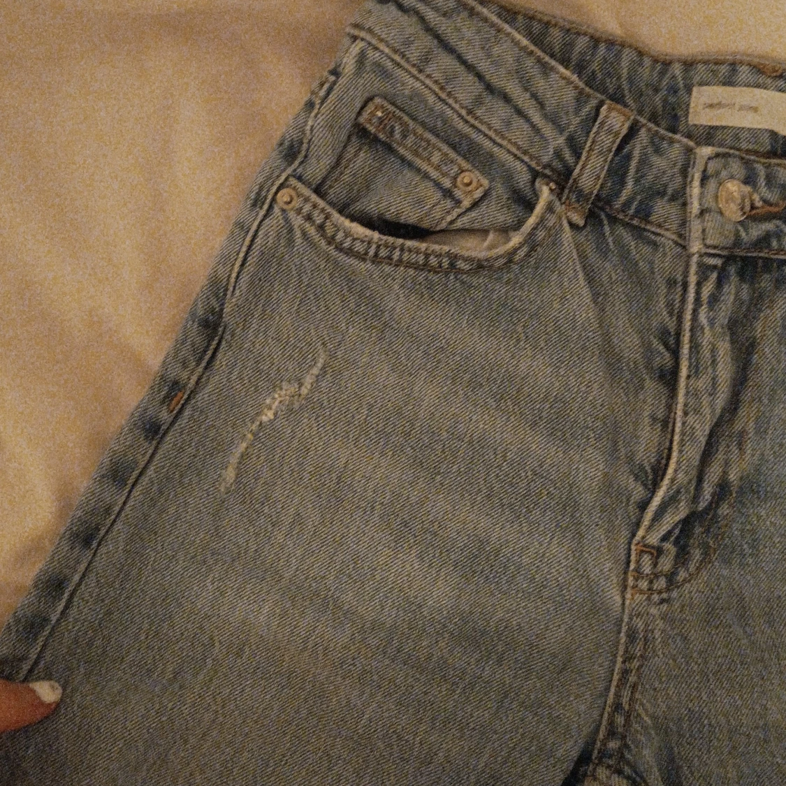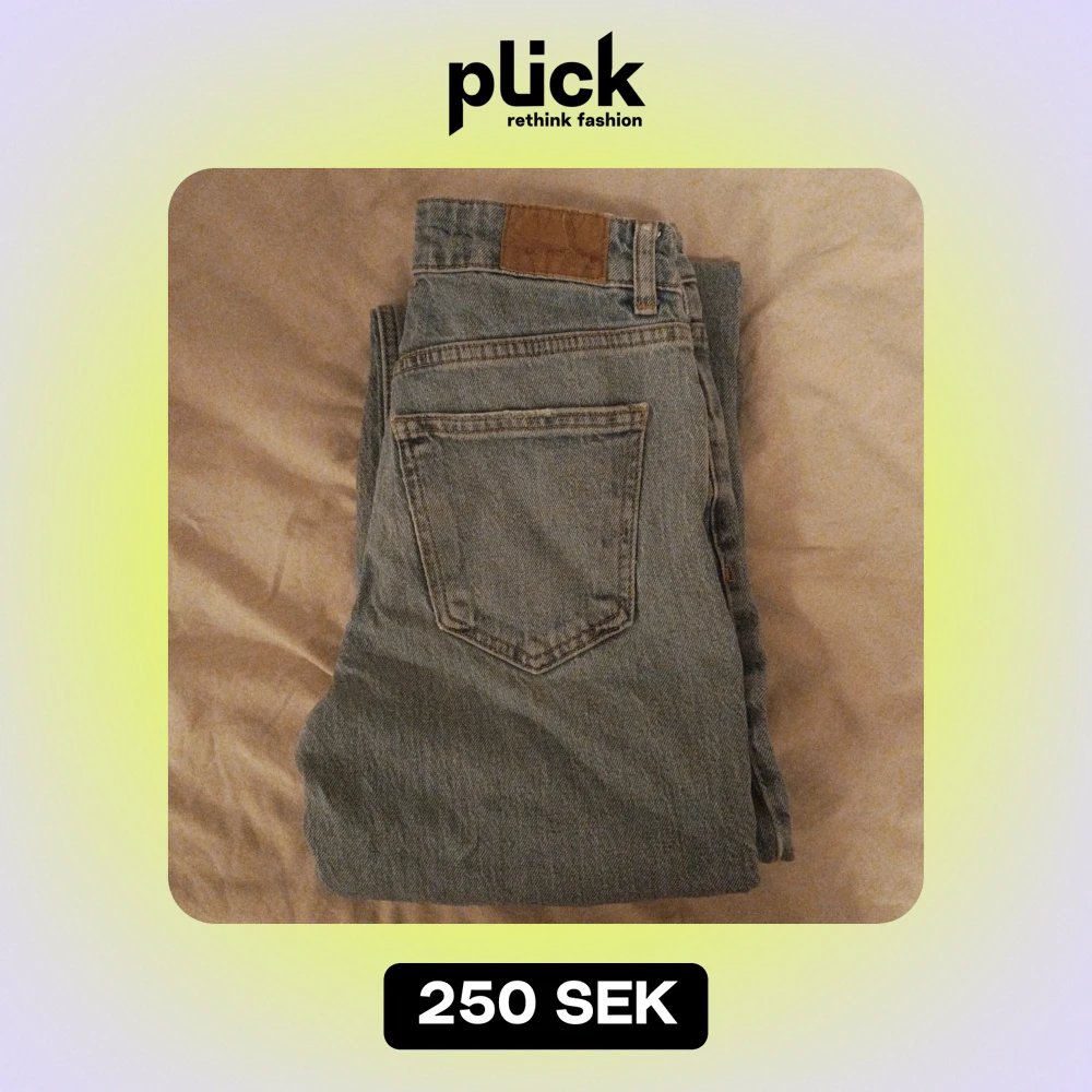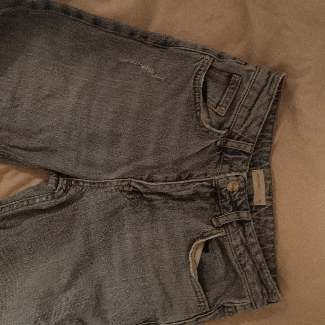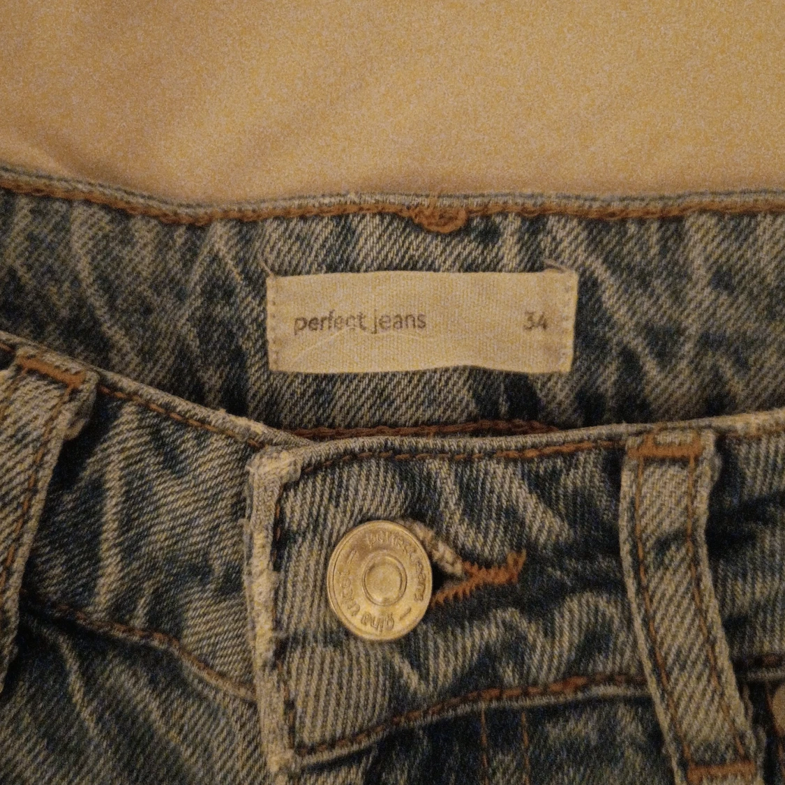 Säljer ett par grå jeans från Perfect Jeans i storlek 34. De har en klassisk design med fem fickor och knappgylf. Jeansen är i bra skick med en liten sliten detalj på benet som ger dem en cool look. Perfekta för vardagsbruk! Perfekt passform för dom som vill framhäva kurvor