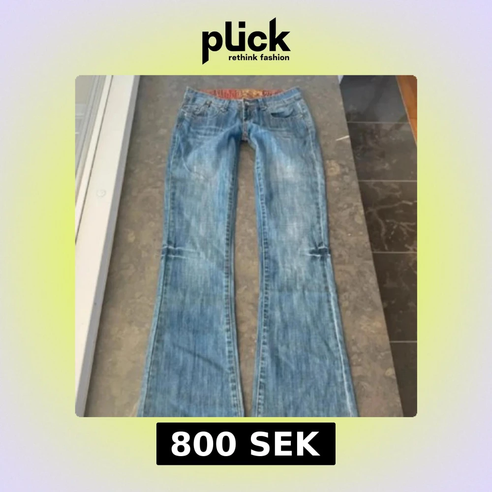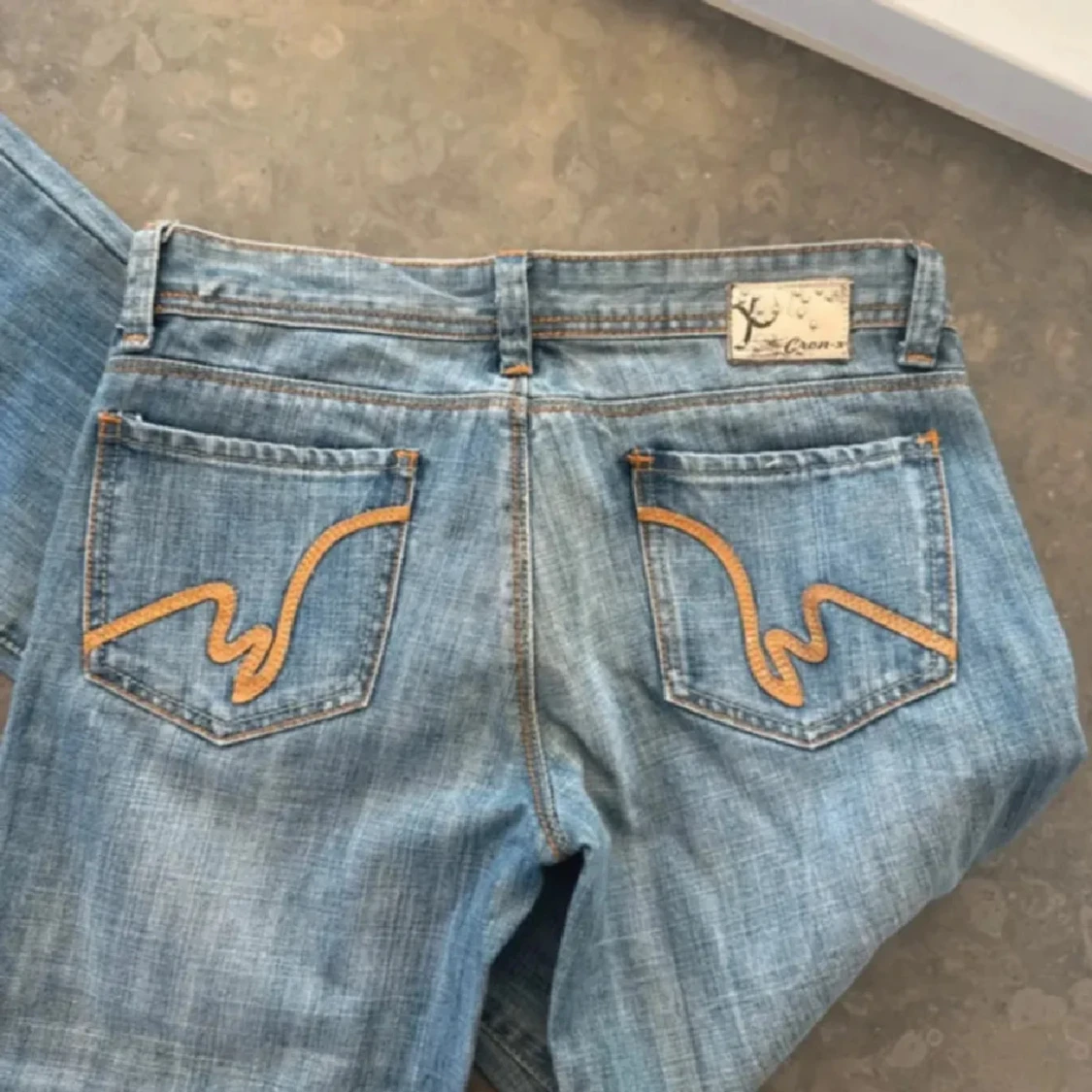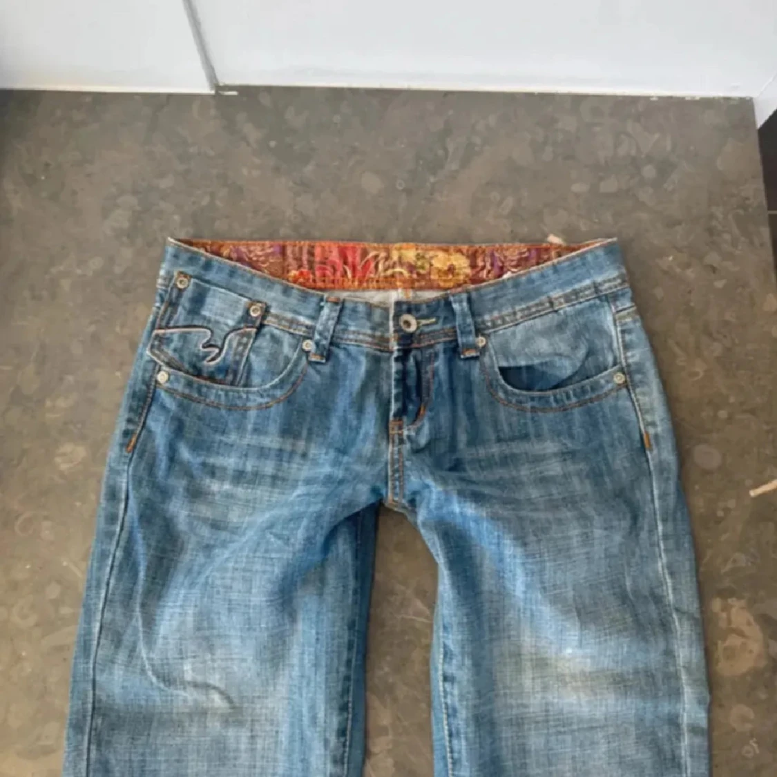 Snygga ljusblå jeans från JC Jeans med klassisk femficksmodell och orange broderi på bakfickorna. Byxorna har låg midja och bootcut-ben, samt ett färgglatt innerfoder i midjan. Perfekta för dig som gillar en avslappnad och trendig look. Midja - 38 höjd- 18 innerben - 84
