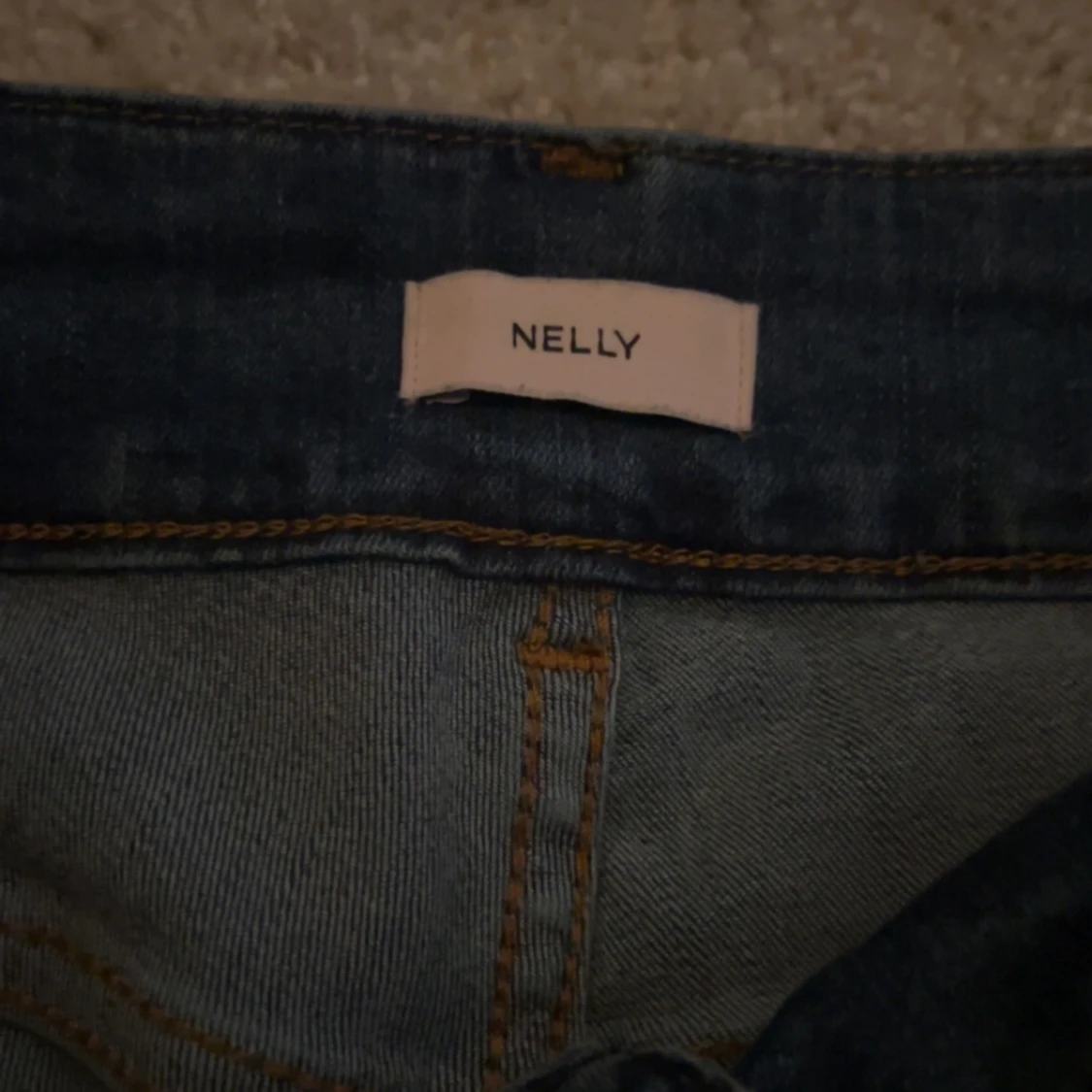 Super söta blåa jeans från Nelly. Jeansen har ett stretchigt material och kan därför passa större storlekar. Jeansen har lite tecken på använd längst ner på vänster ben. Säljer då dem inte kommer till använd längre. Dom är i storlek 36. Midjemått: 34 cm rakt över. Innerbenslängd: 81 cm💞💞