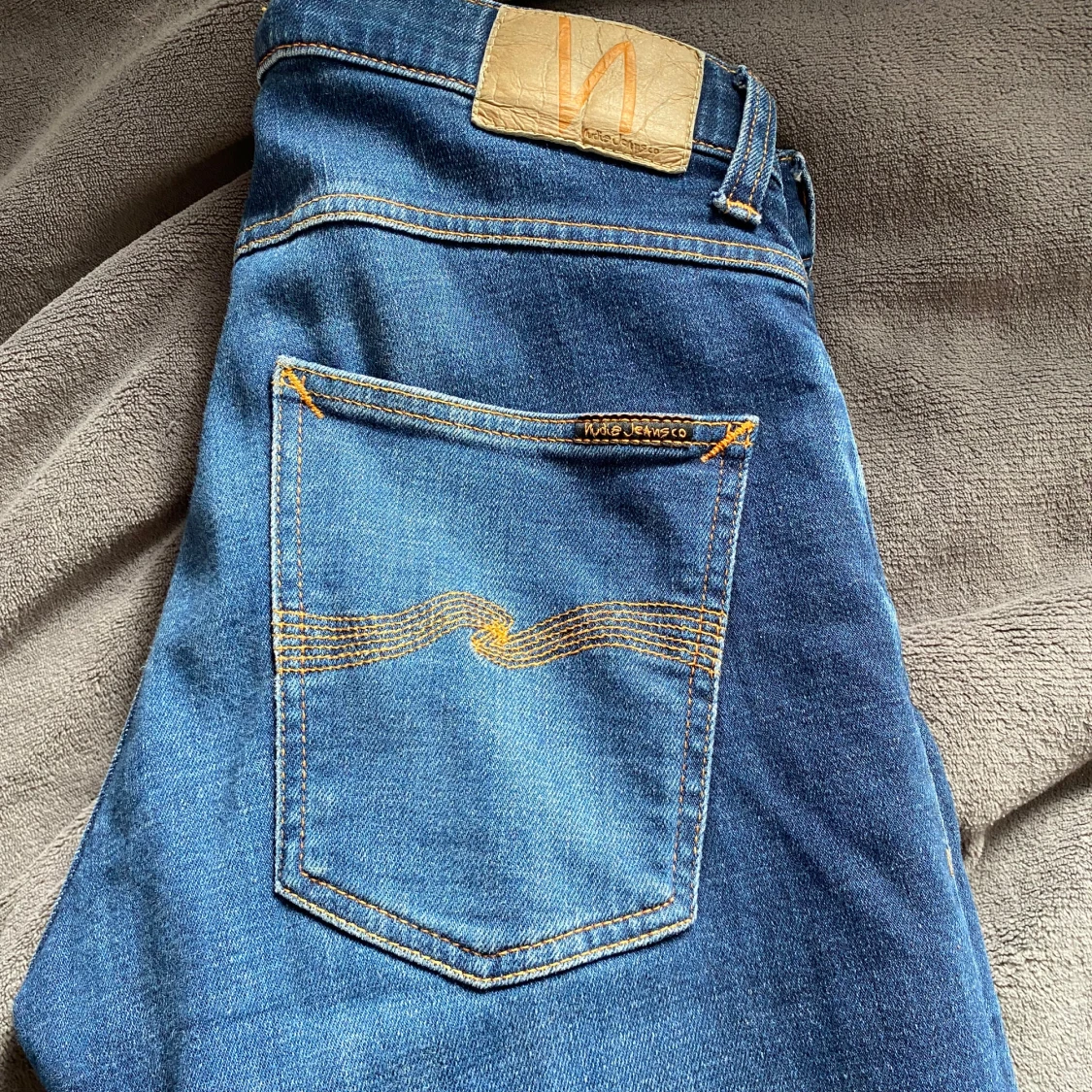Säljer ett par snygga blåa jeans från Nudie. Märkeslogga på bakfickan och knappar baktill. Använda ett par gånger men i mycket bra skick. Storlek 31/32, modellen är Grim Tim! Hör av dig vid fler frågor eller bilder!