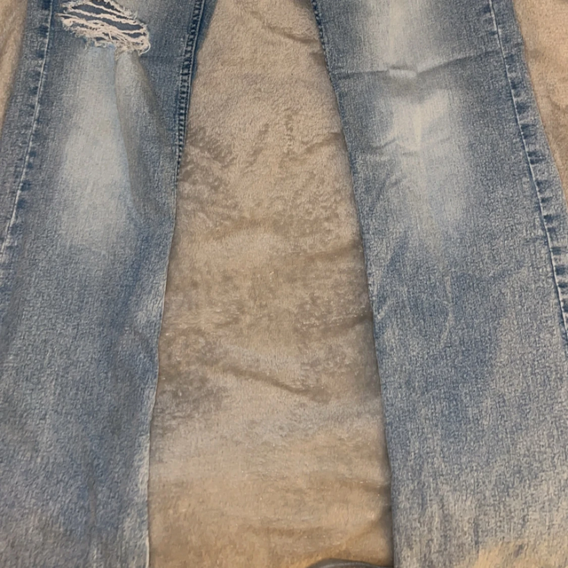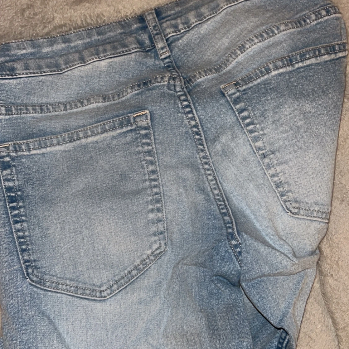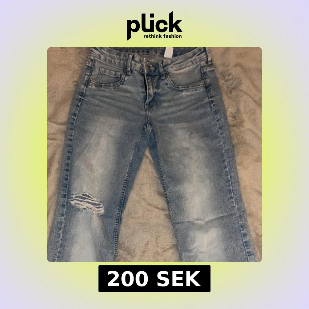Säljer ett par blåa jeans med stretch, samt håll i ena knäet. Köpta ifrån H&M.