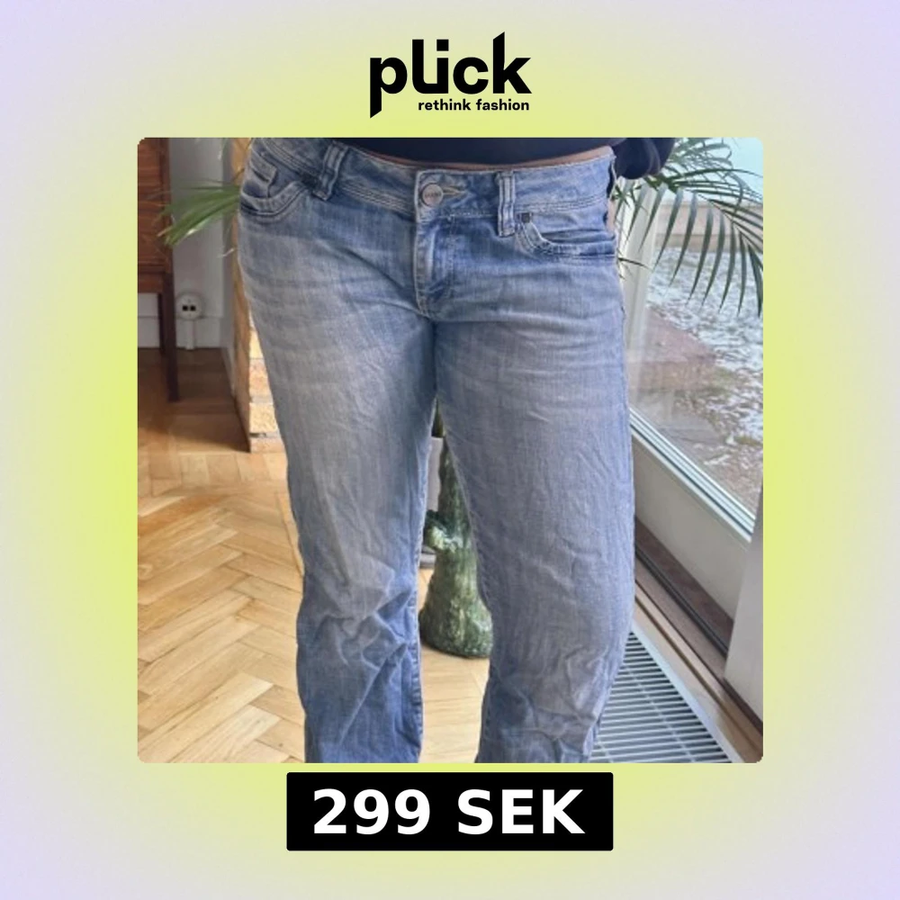 Snygga blå jeans med bootcut-stil och låg midja. Perfekta för en avslappnad look. Klassisk femficksdesign och knappgylf. Lite skrynkliga på bilden men dom är utsvängda men det syns ej pga skorna💕