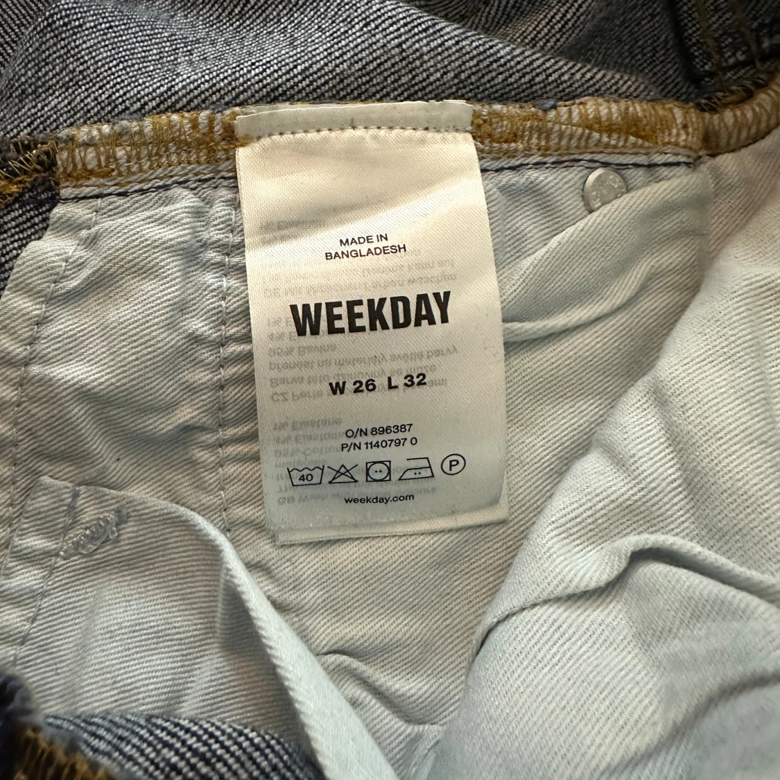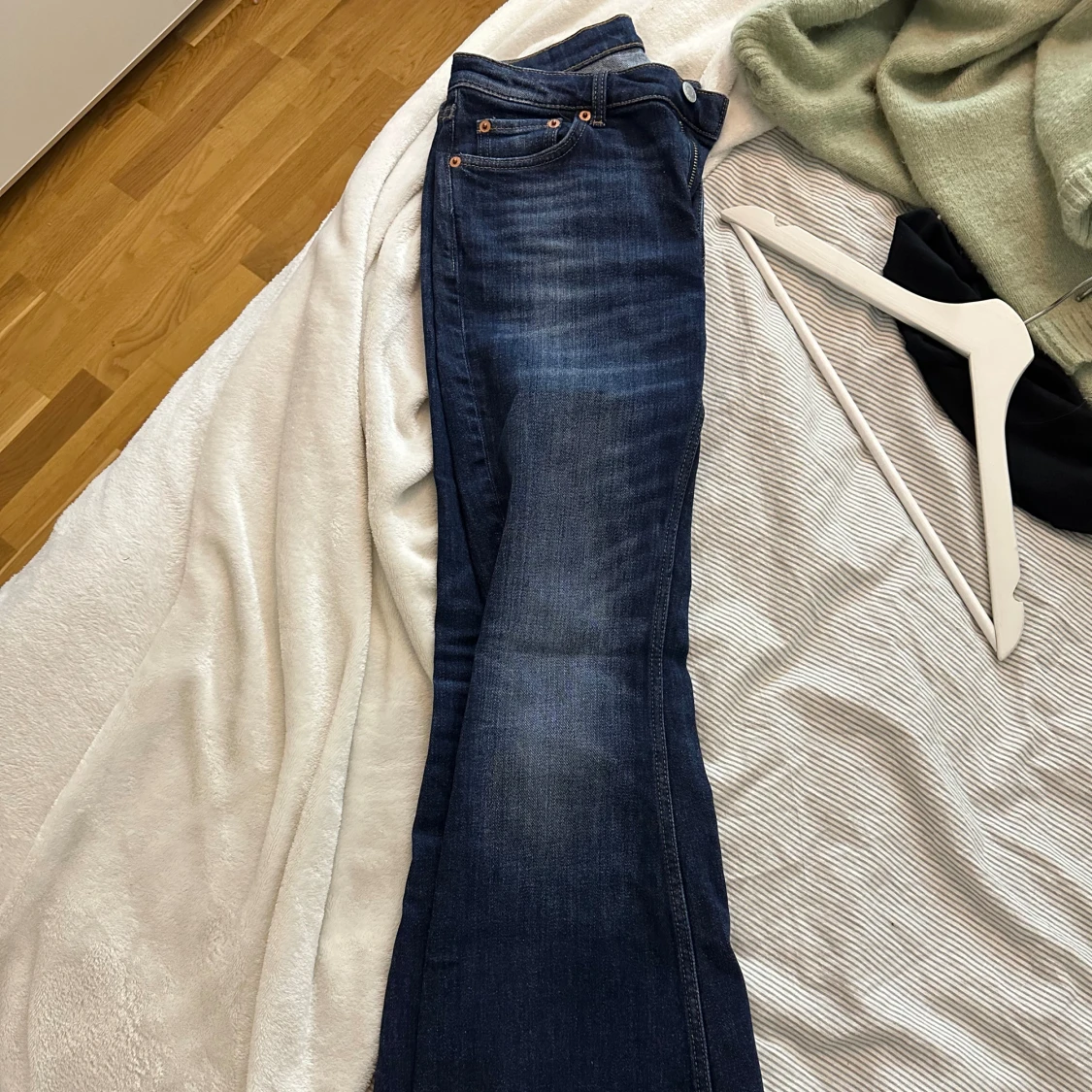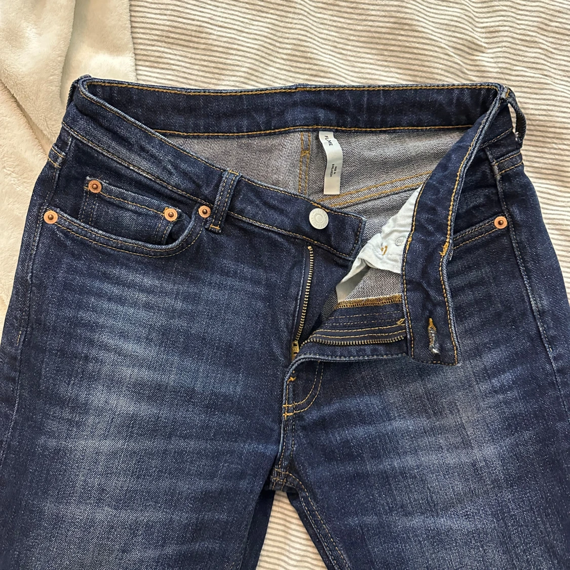 Snygga mörkblå bootcut jeans från Weekday med klassisk femficksdesign och gul kontrastsöm. Jeansen har låg midja och dragkedja. Pris kan diskuteras!