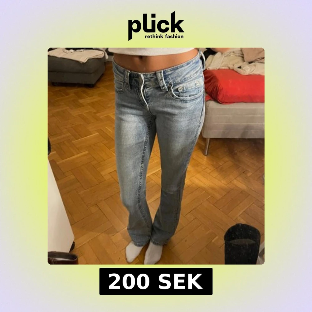Snygga blåa låg midjade men utsvängda ben och klassisk femficksdesign. Är från Gina Tricot och modellen har varit slutsålt ett tag💞