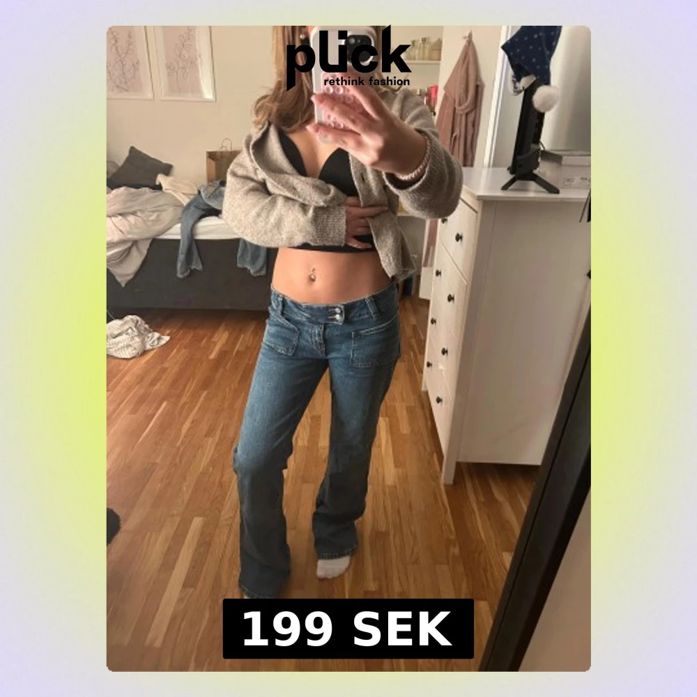 Säljer ett par blåa jeans med låg midja och bootcut-ben. Jeansen har dubbla knappar i midjan, stora framfickor och raka bakfickor. Klassisk denim-look med lite utsvängda ben och snygg passform. Perfekta för dig som gillar 00-talsvibbar.