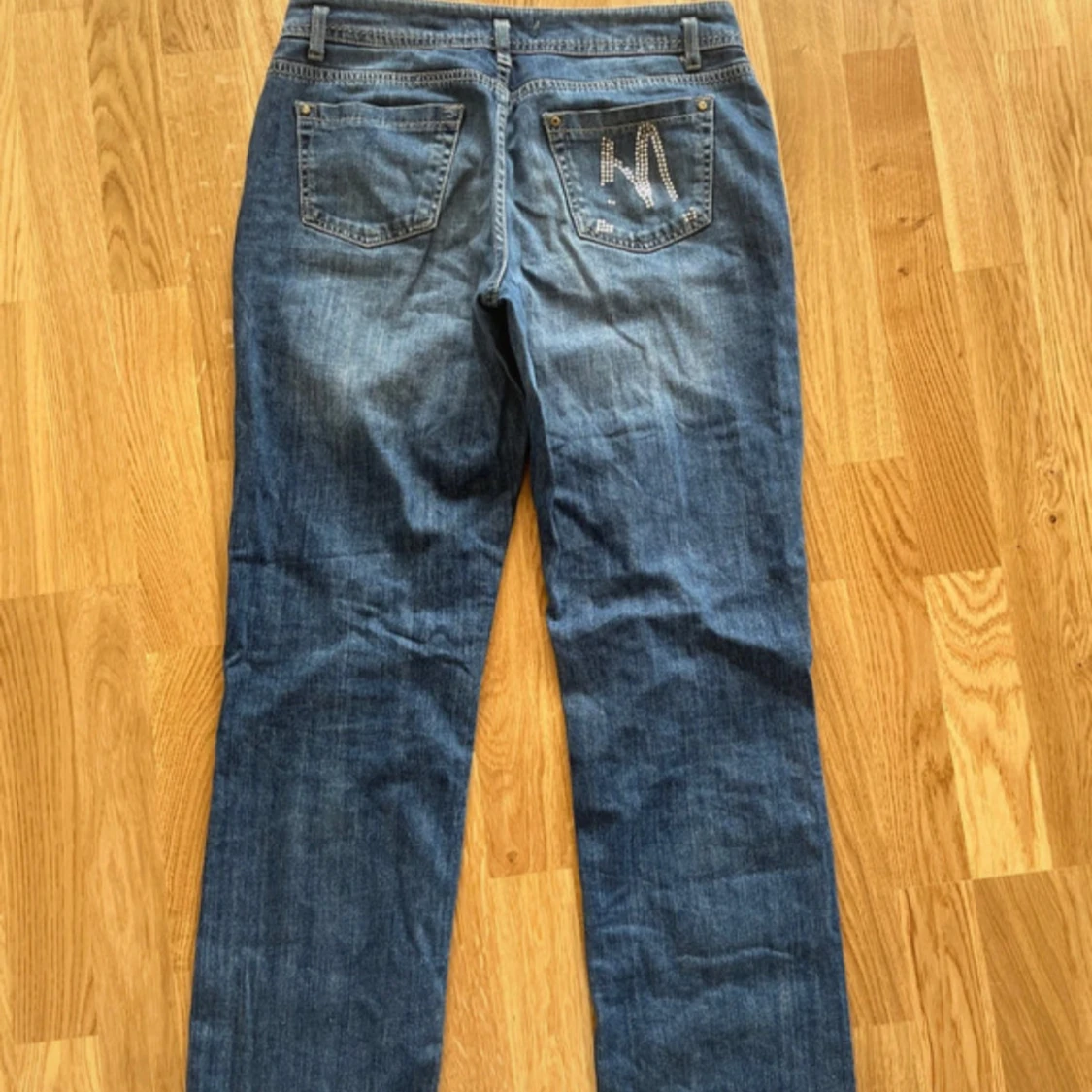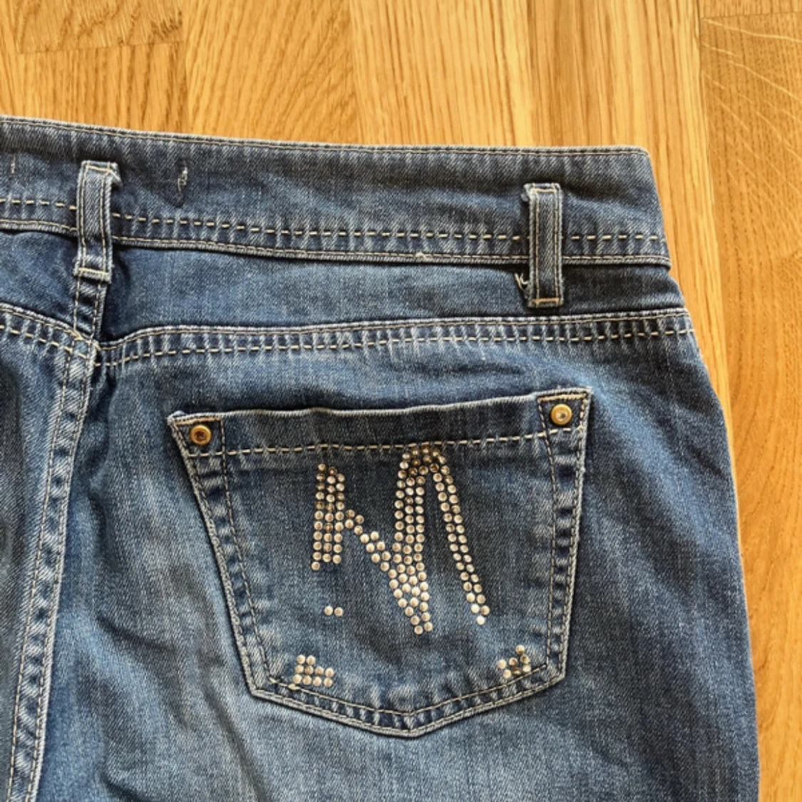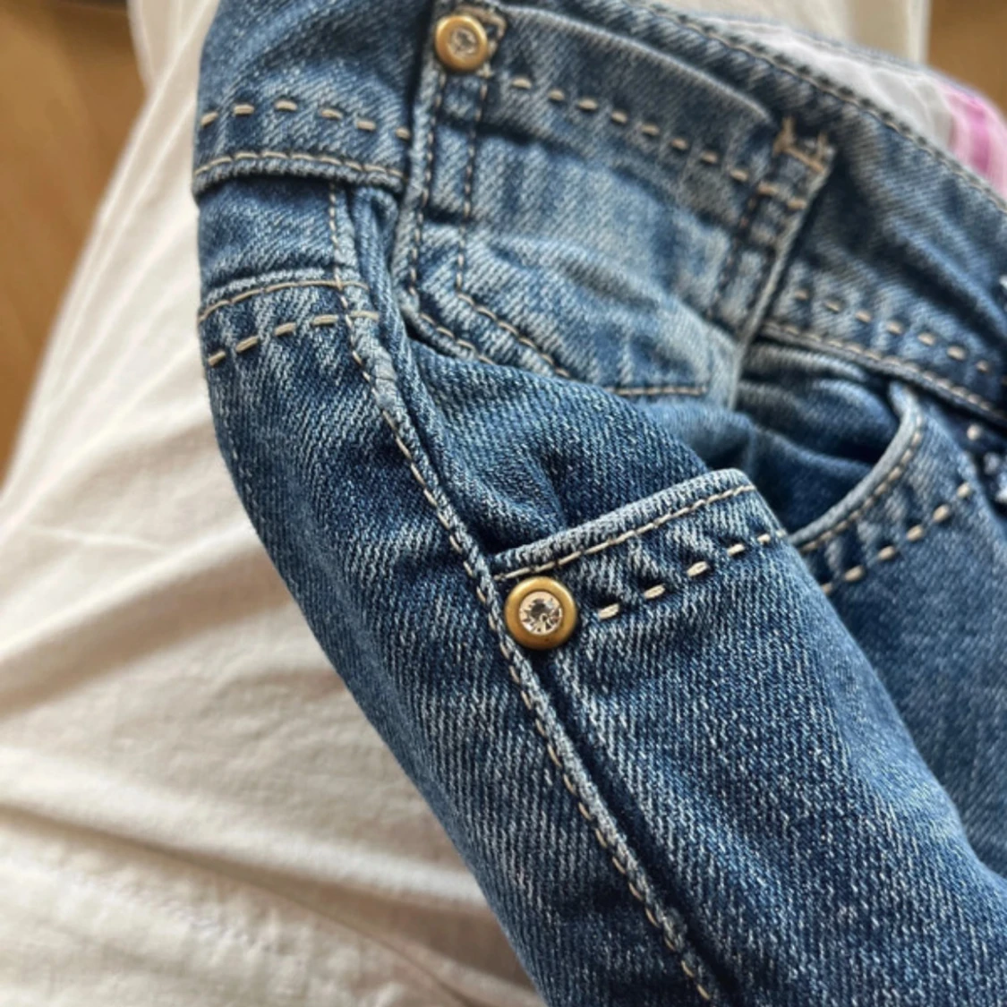 Blåa lågmidjade jeans med silver detaljer. Det står att dom är i strl 40 men skulle säga att dom är mer som strl 38. Bra skick, lite slitet på silverdetaljerna baktill.
