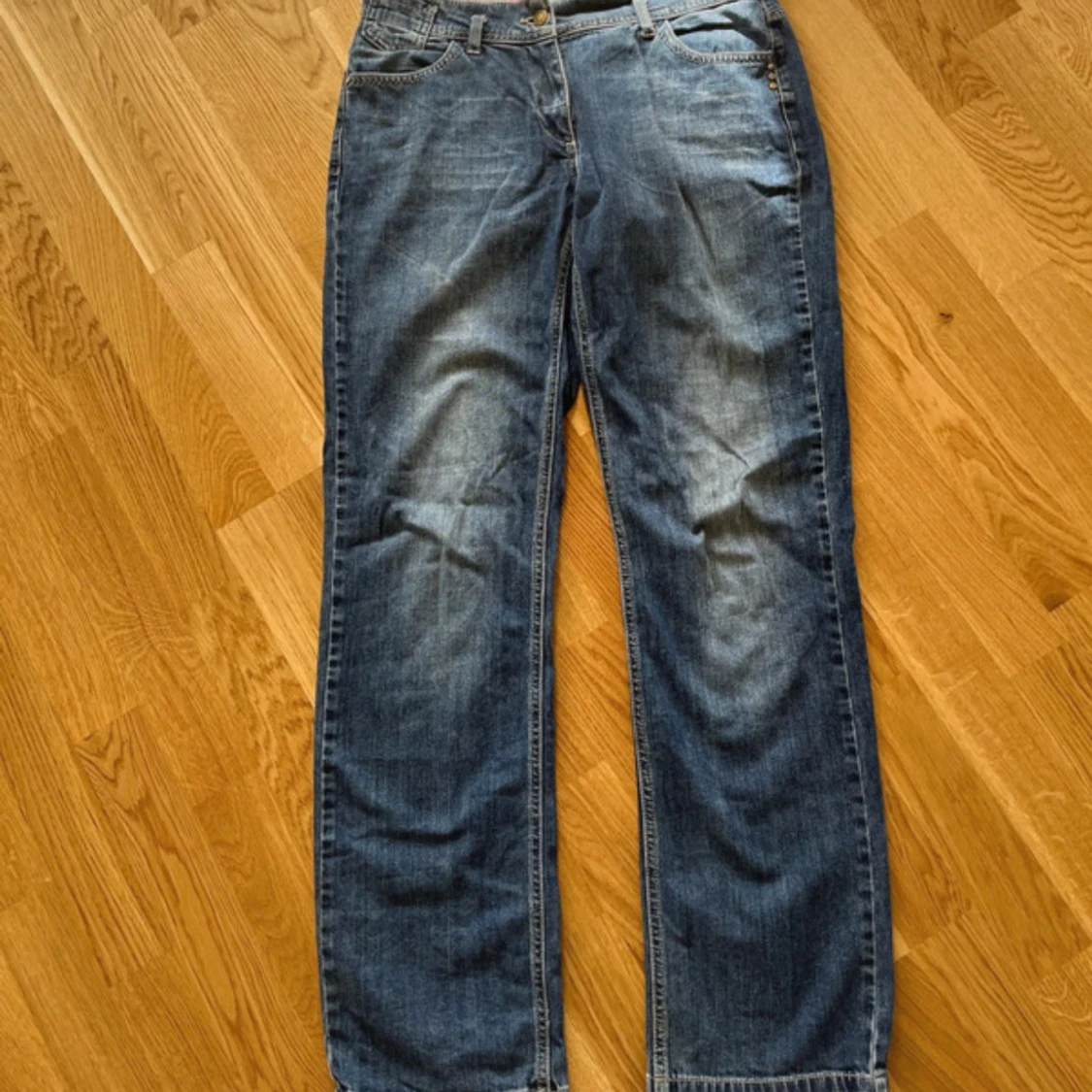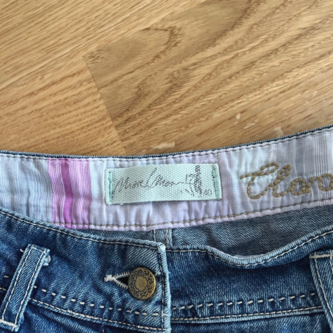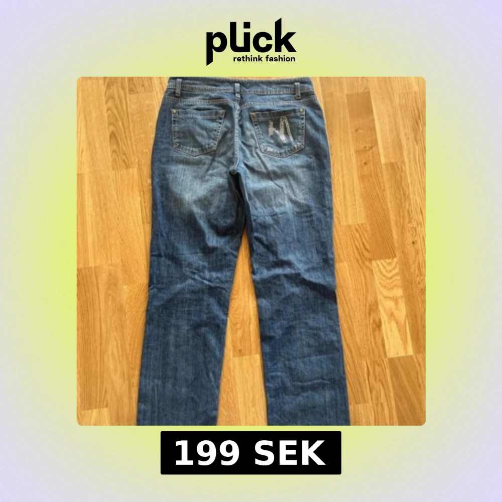 Blåa lågmidjade jeans med silver detaljer. Det står att dom är i strl 40 men skulle säga att dom är mer som strl 38. Bra skick, lite slitet på silverdetaljerna baktill.