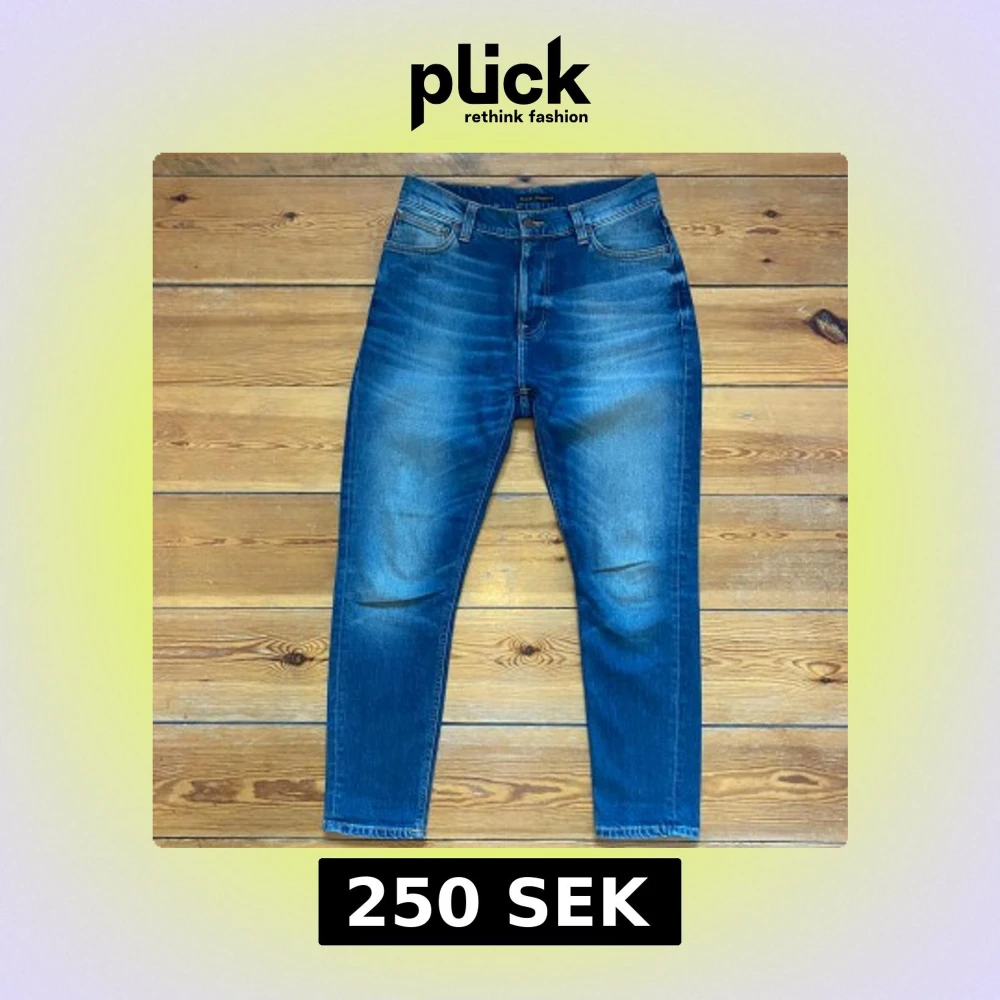 Ett par blåa jeans från märket Nudie. Är i bra skick förutom ett par fläckar bak på högra benet. Jeansen har storleken 28 i midja och 28 i längd.