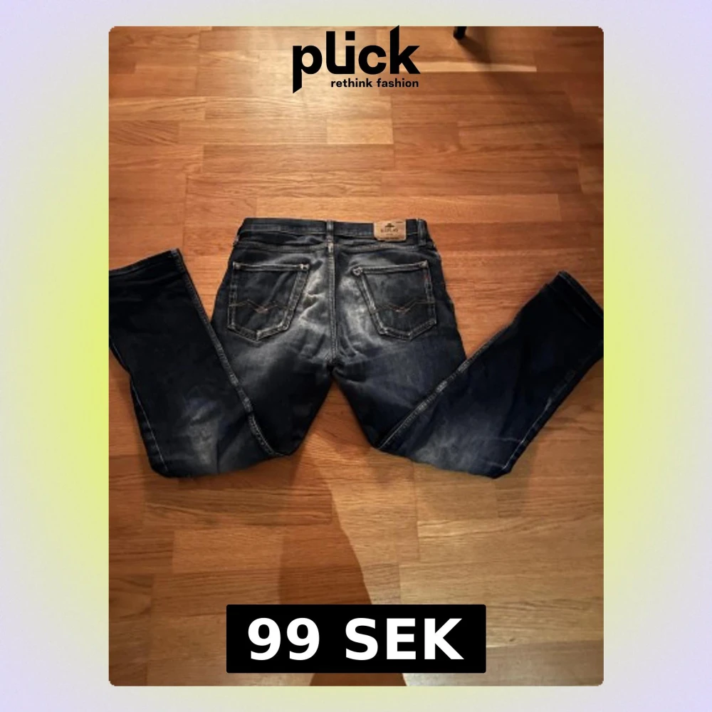 Ett fint par blåa replay jeans som har ganska bra kvalite litet håll men inga större skador