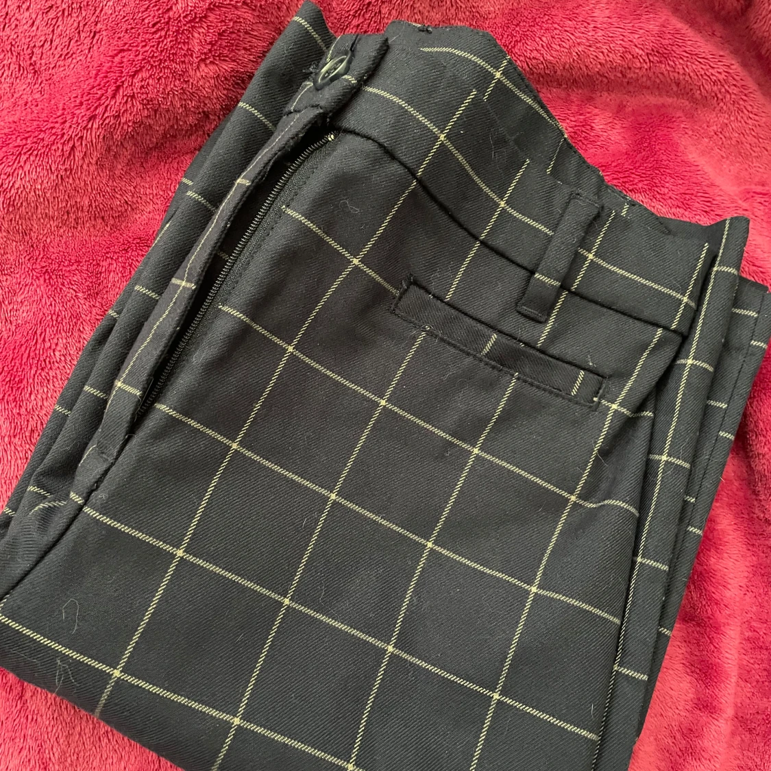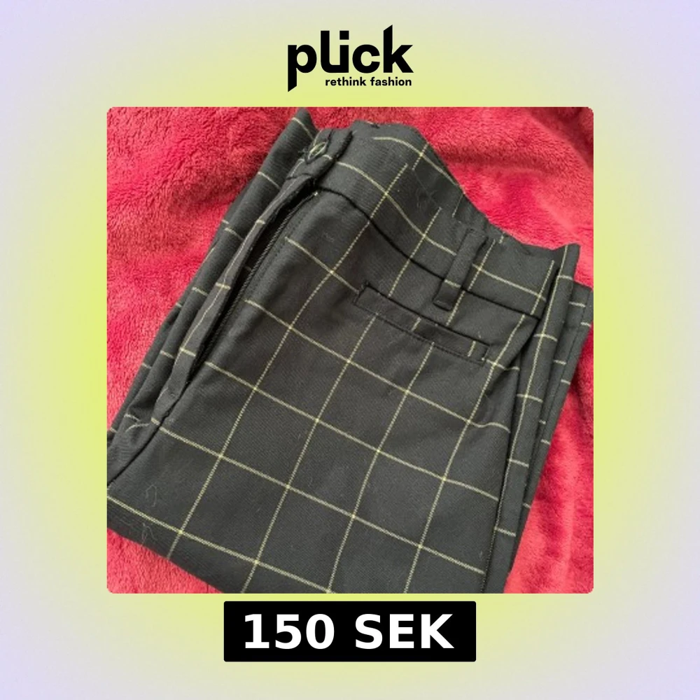 Snygga blåa kostymbyxor med ett stilrent rutmönster i vitt. Utsvängda ner till benen. Har två dubbletter , så har ingen användning för de. Storlek 34
