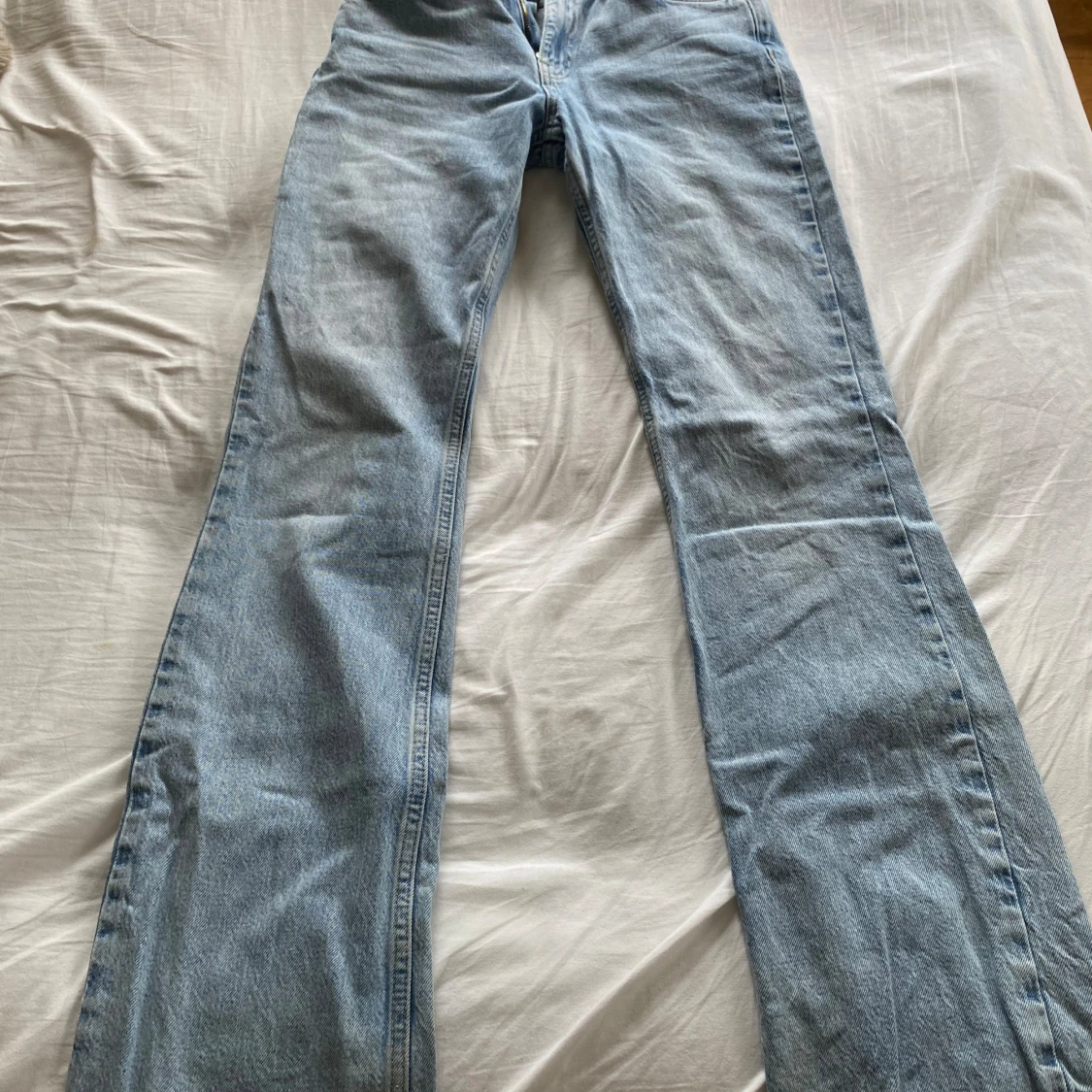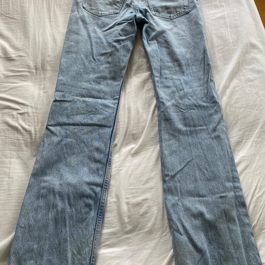 Blåa utsvängda jeans