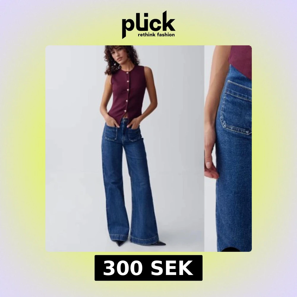 Säljer ett par blåa jeans med hög midja och breda ben. Jeansen har stora, fyrkantiga fickor fram och bak, klassisk jeansknapp och synliga sömmar. Perfekta för dig som gillar en avslappnad och trendig look.