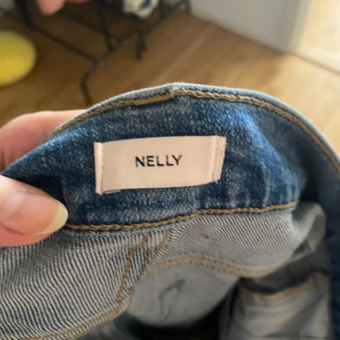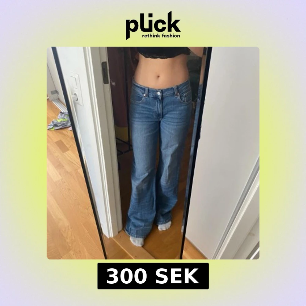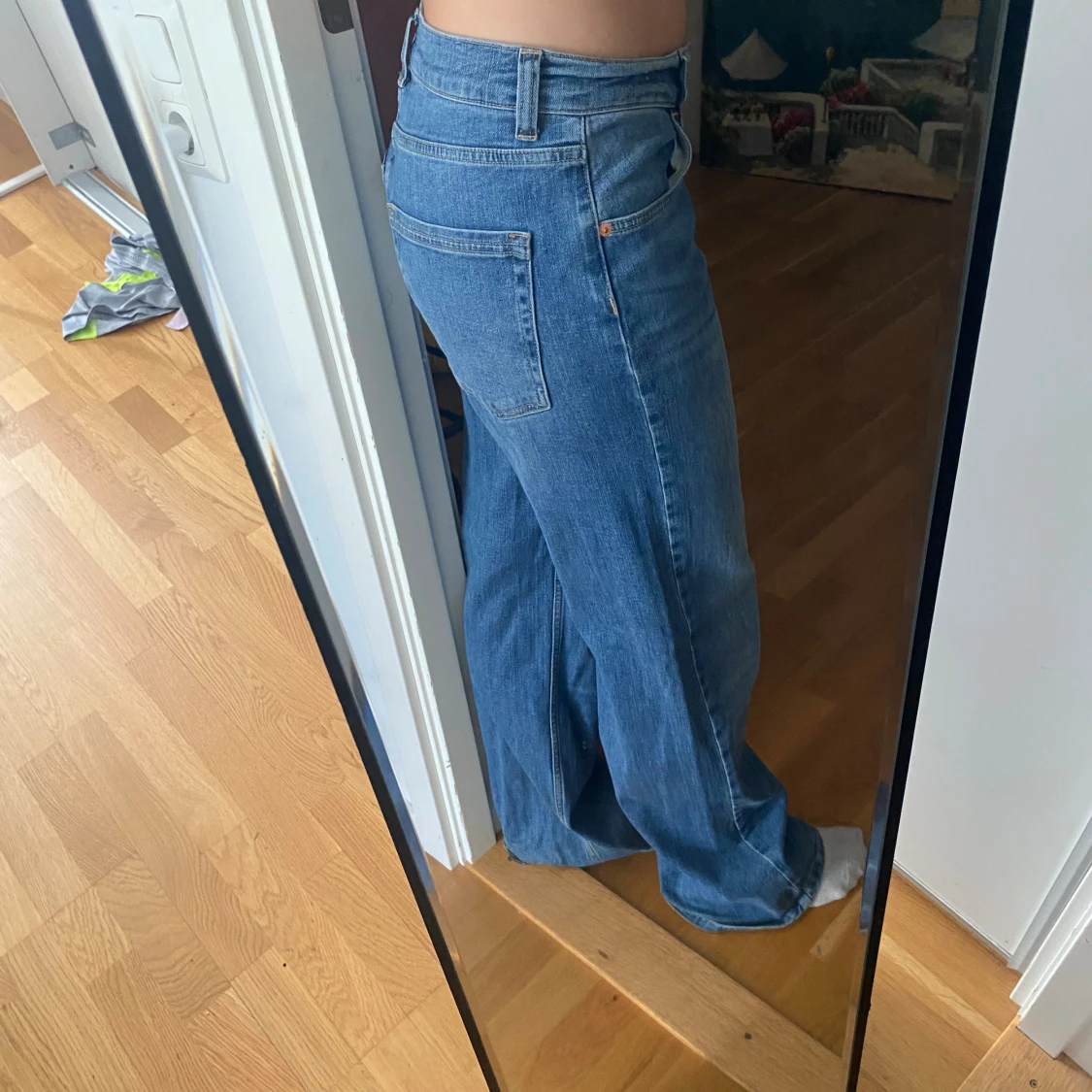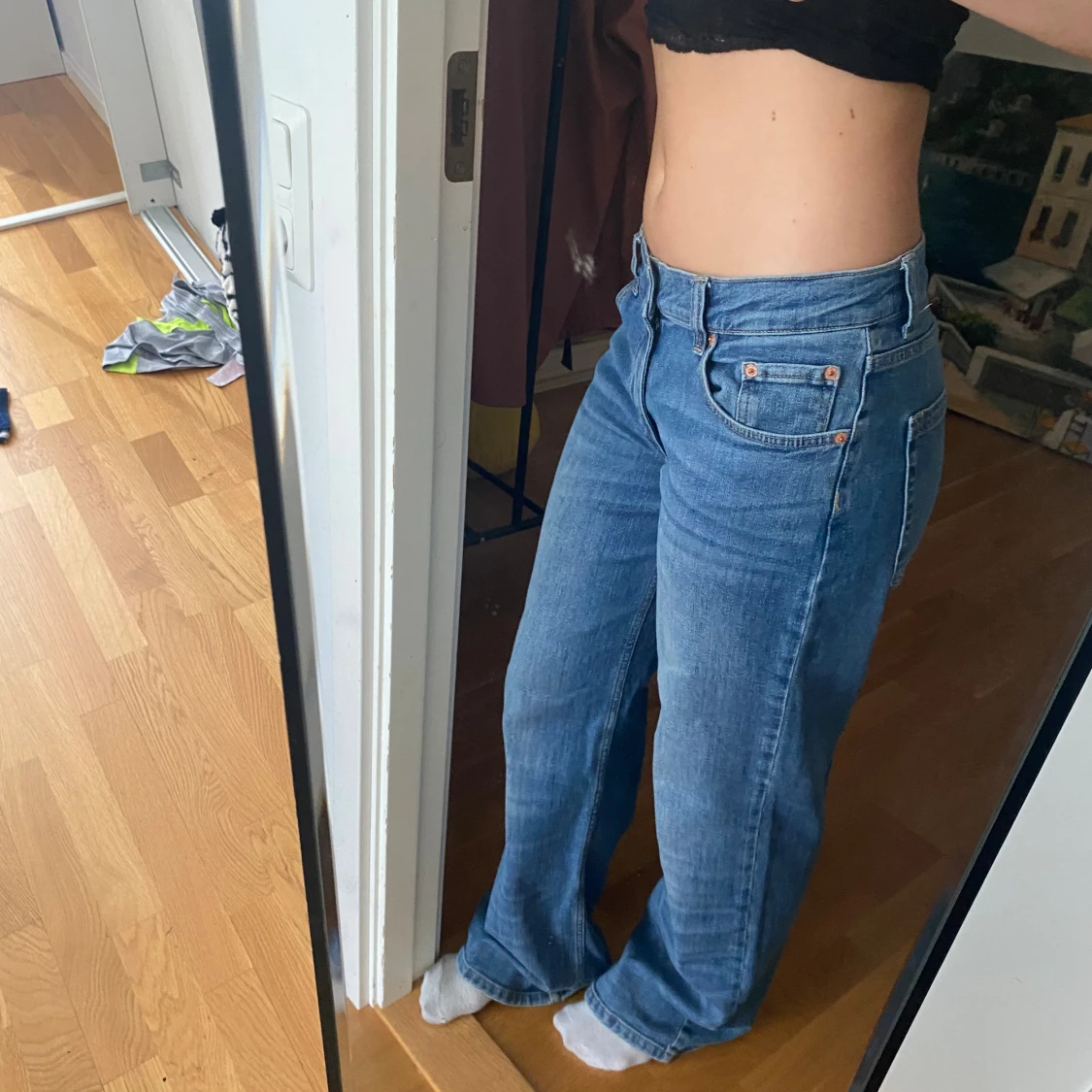 Säljer ett par blåa jeans med låg midja och breda ben. Klassisk femficksmodell med snygga sömmar och bälteshällor. Jeansen har en avslappnad passform och är tillverkade i jeansmaterial. Perfekta för en chill och trendig look.