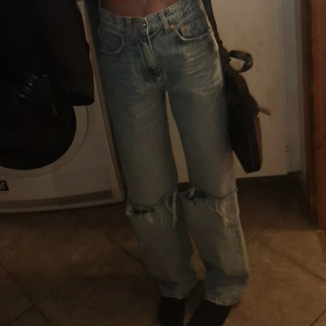 Dessa jeansen är högmidjade jeans från Gina tricot med två hål vid knäna! De är super fina men inte riktigt min stil längre. Köptes för 599kr!