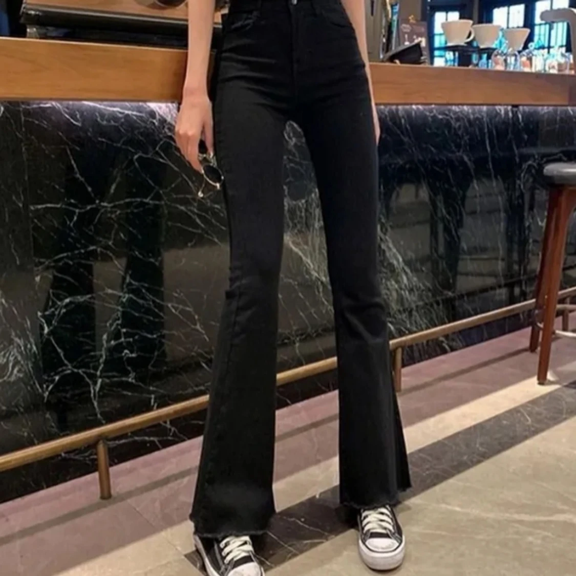 Svarta utsvängda byxor
