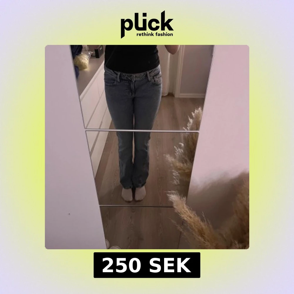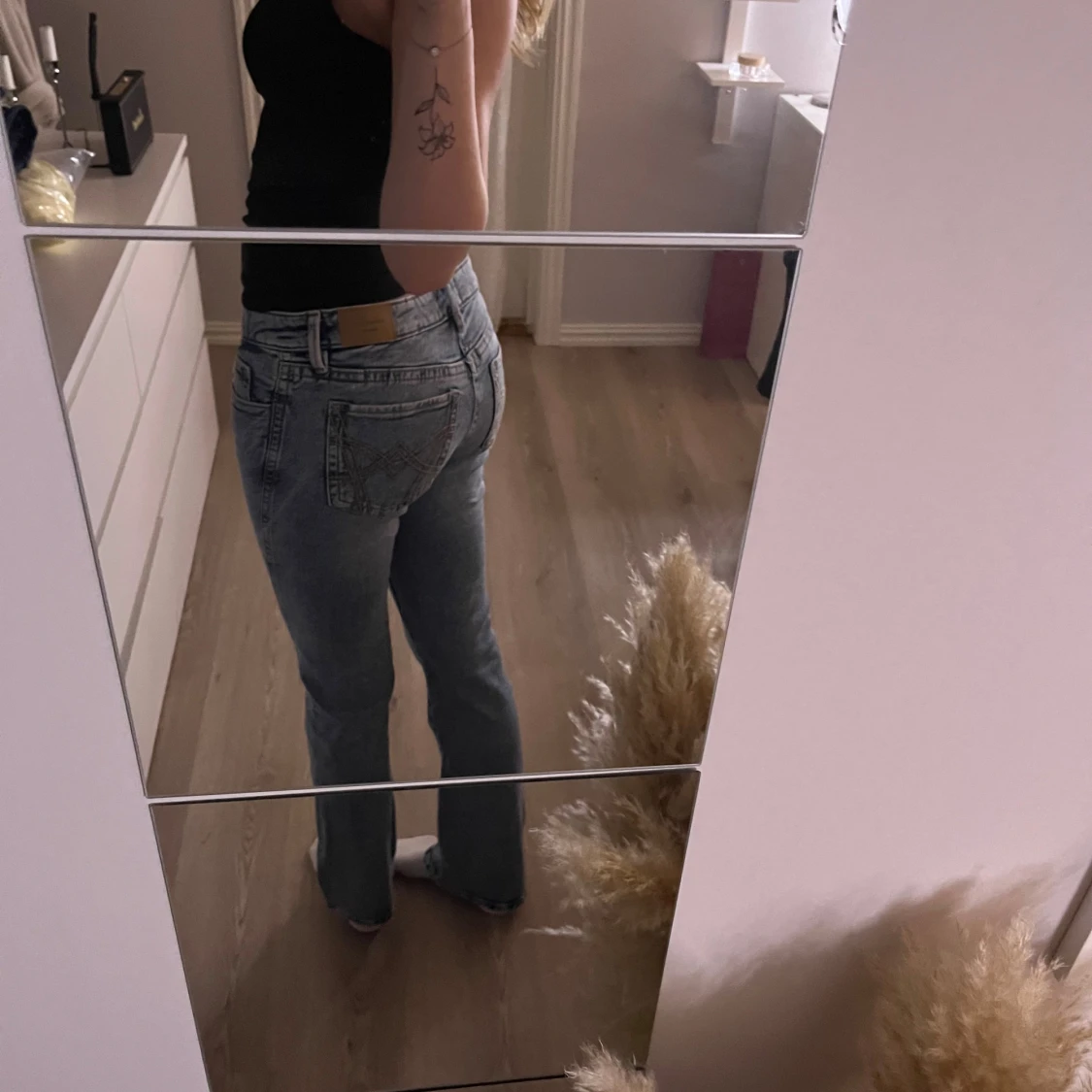 Säljer ett par blå jeans med bootcut-modell och snygga broderade detaljer på bakfickorna. Jeansen har klassisk femficksdesign, normal passform och är tillverkade i jeansmaterial. Perfekta för dig som gillar en avslappnad men ändå stilren look.