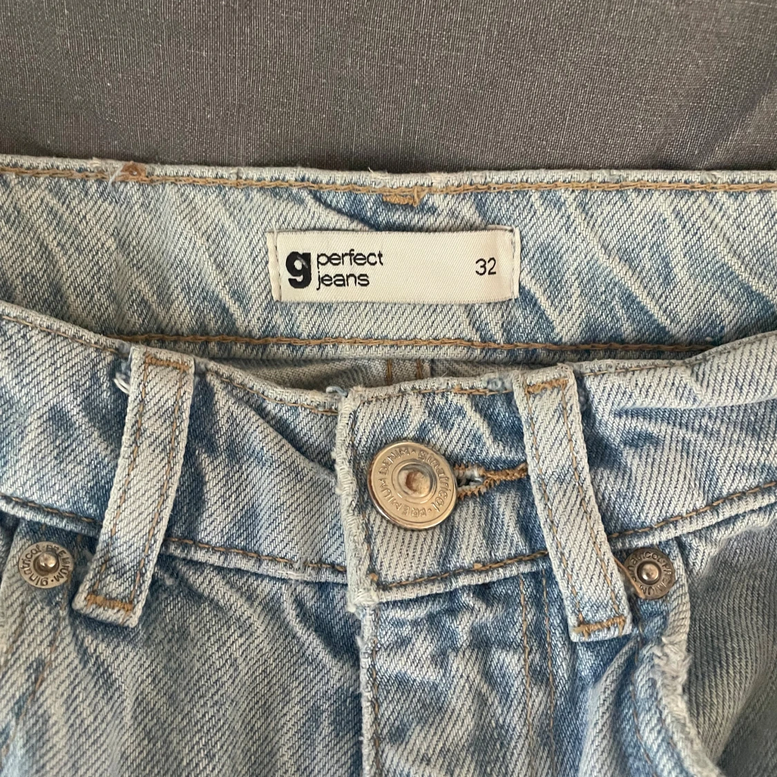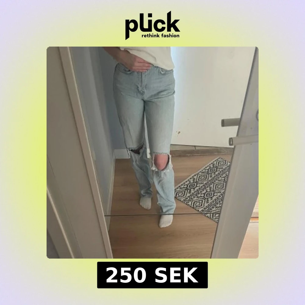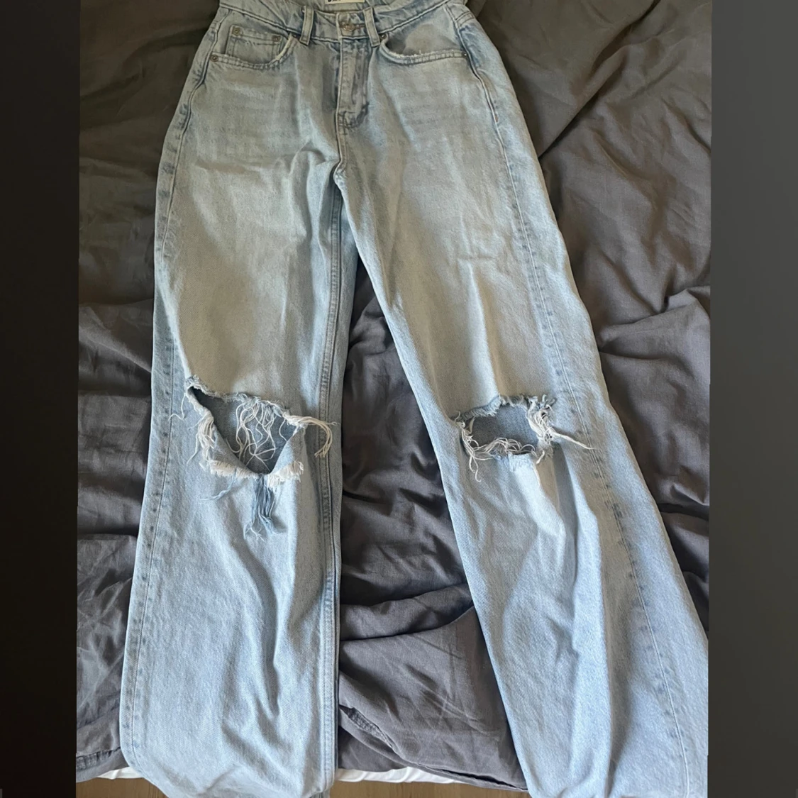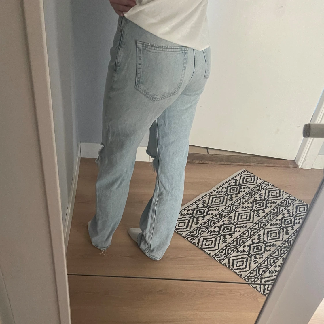 Ljusblå jeans från Gina med raka ben och stora slitningar över båda knäna. Hög midja och klassisk femficksmodell. Bara att höra av sig om man undrar något💕