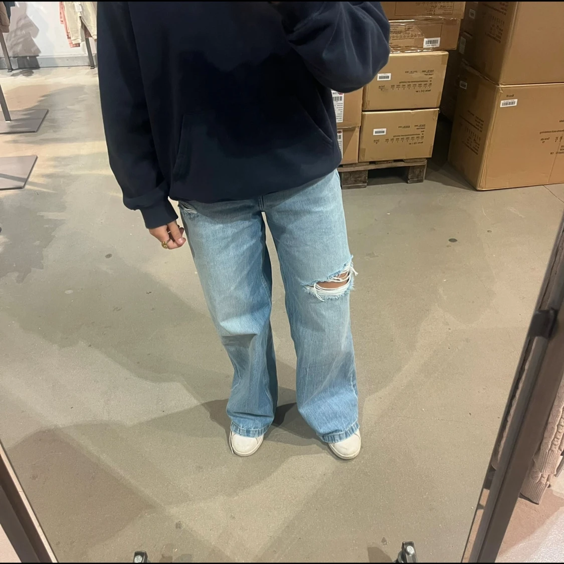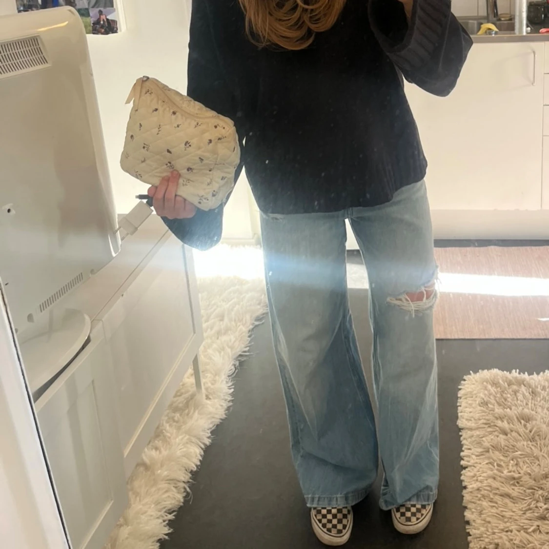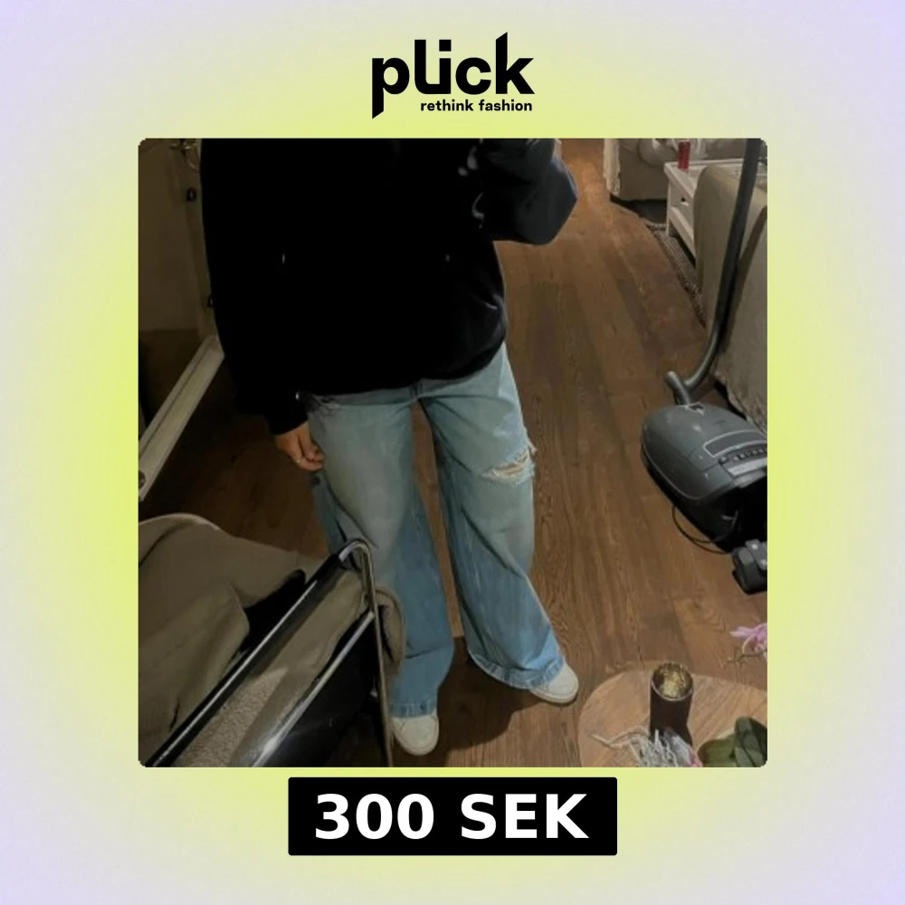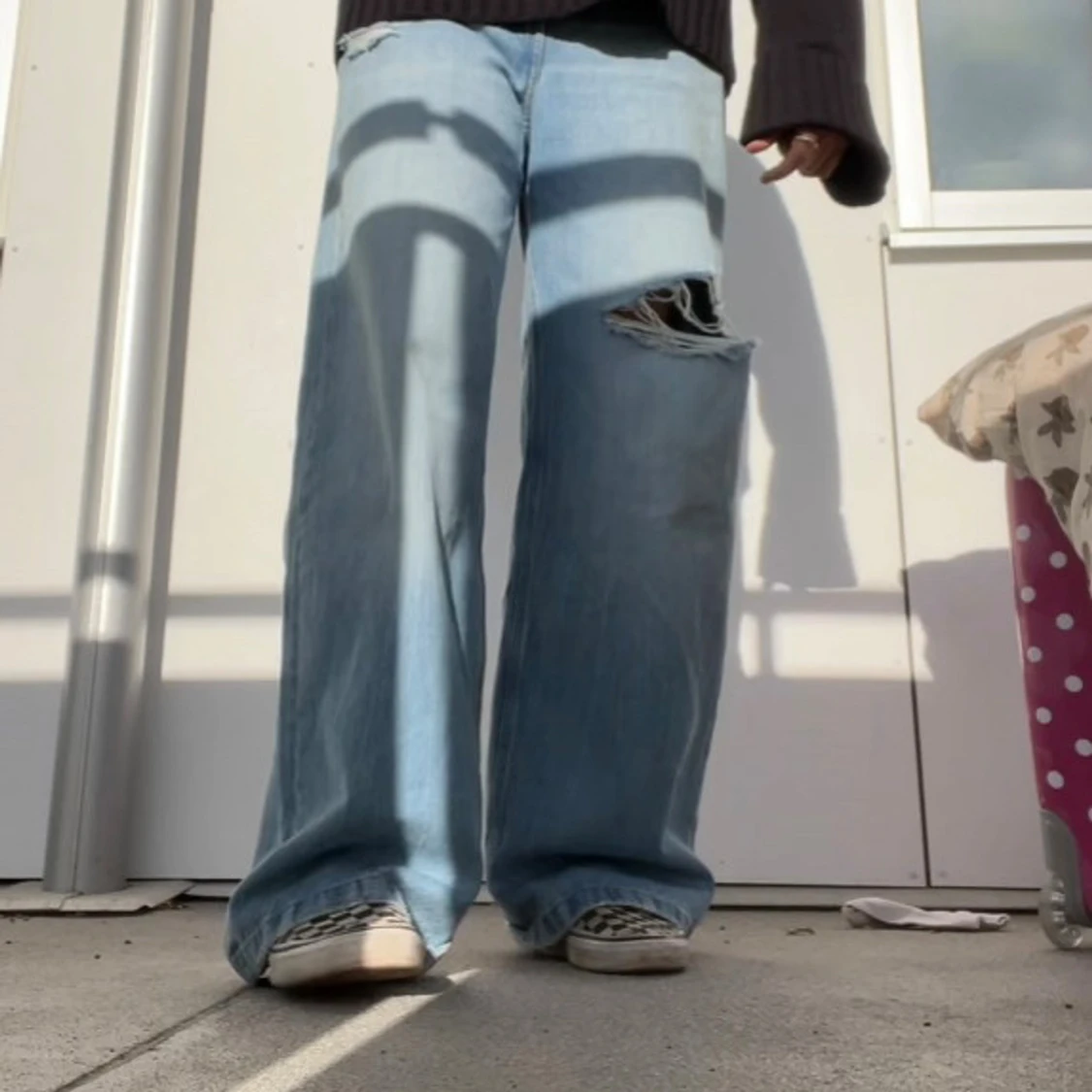 Säljer ett par ljusblå jeans med breda ben och cool slitning vid knät. Modellen är loose fit och har en avslappnad vibe. Använda 2 gånger, passar mig som vanligtvis har 36. Skriv vid frågor och funderingar! 🫶🏼