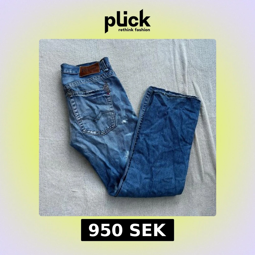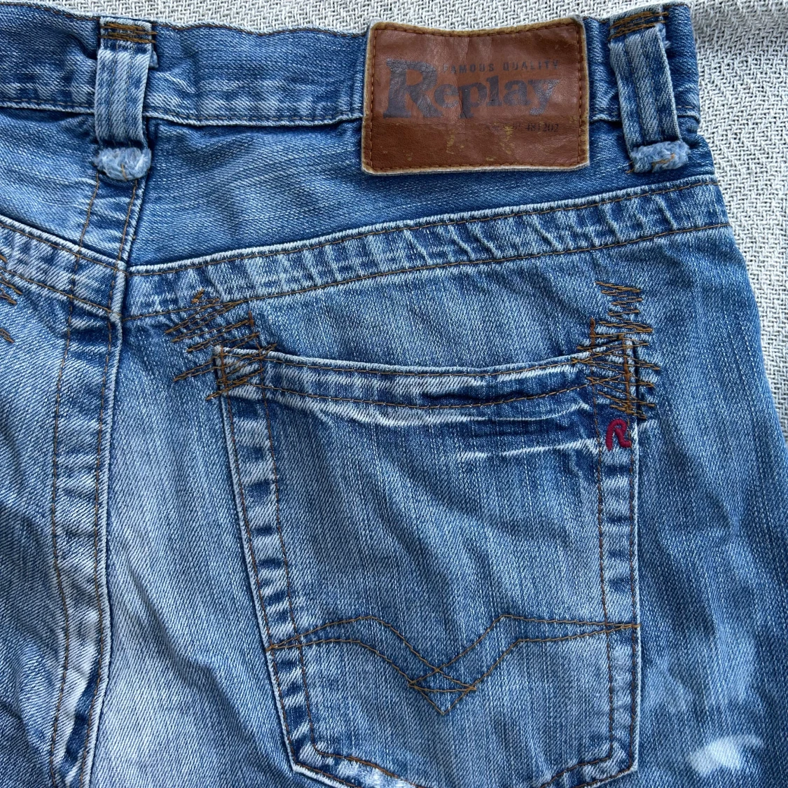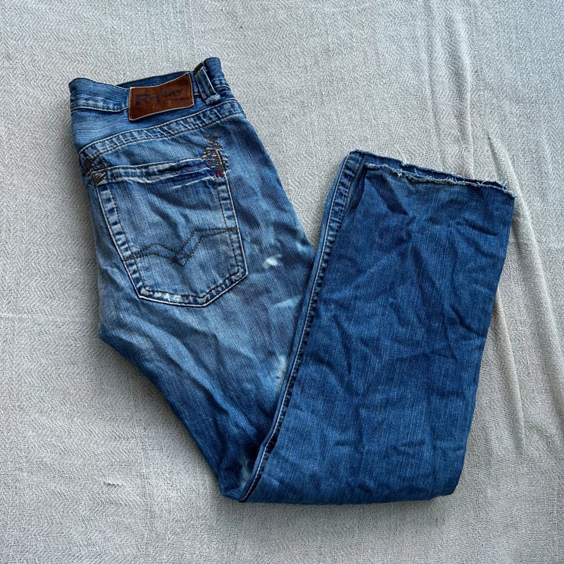 Säljer ett par blå jeans från Replay med snygga slitningar och ljusa tvättade partier. Klassisk femficksmodell med raka ben och knappar i gylfen. Jeansen har detaljerade sömmar på bakfickorna och läderpatch med Replay-logga i midjan.