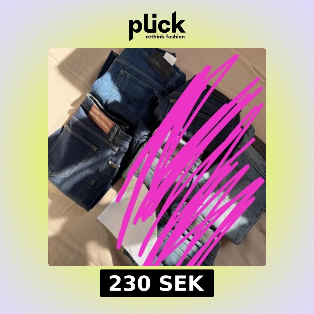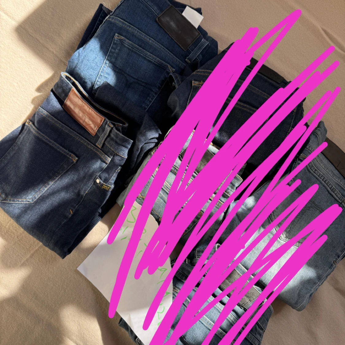 Säljer flera par klassiska mörkblå jeansbyxor i olika tvättar. Byxorna har fem fickor, bälteshällor och stängs med dragkedja och knapp. Perfekta för en stilren och avslappnad look.