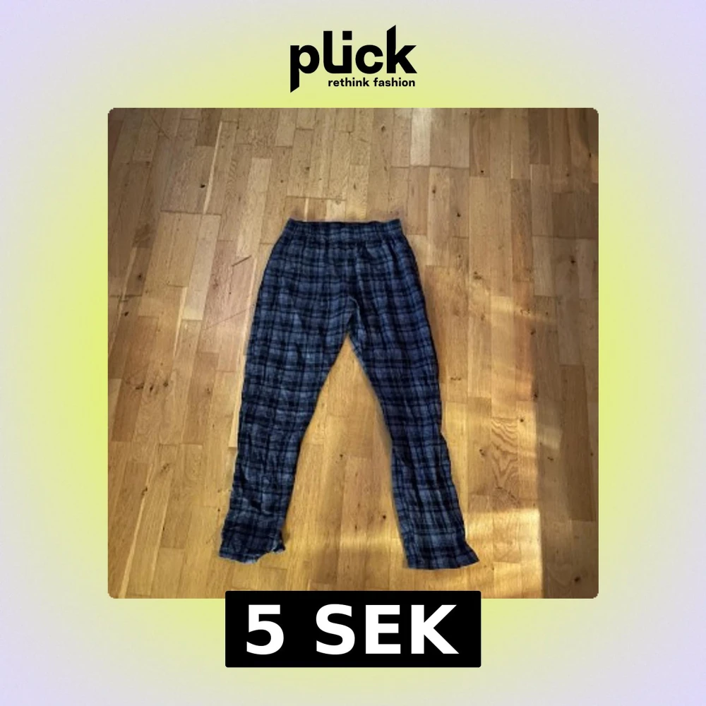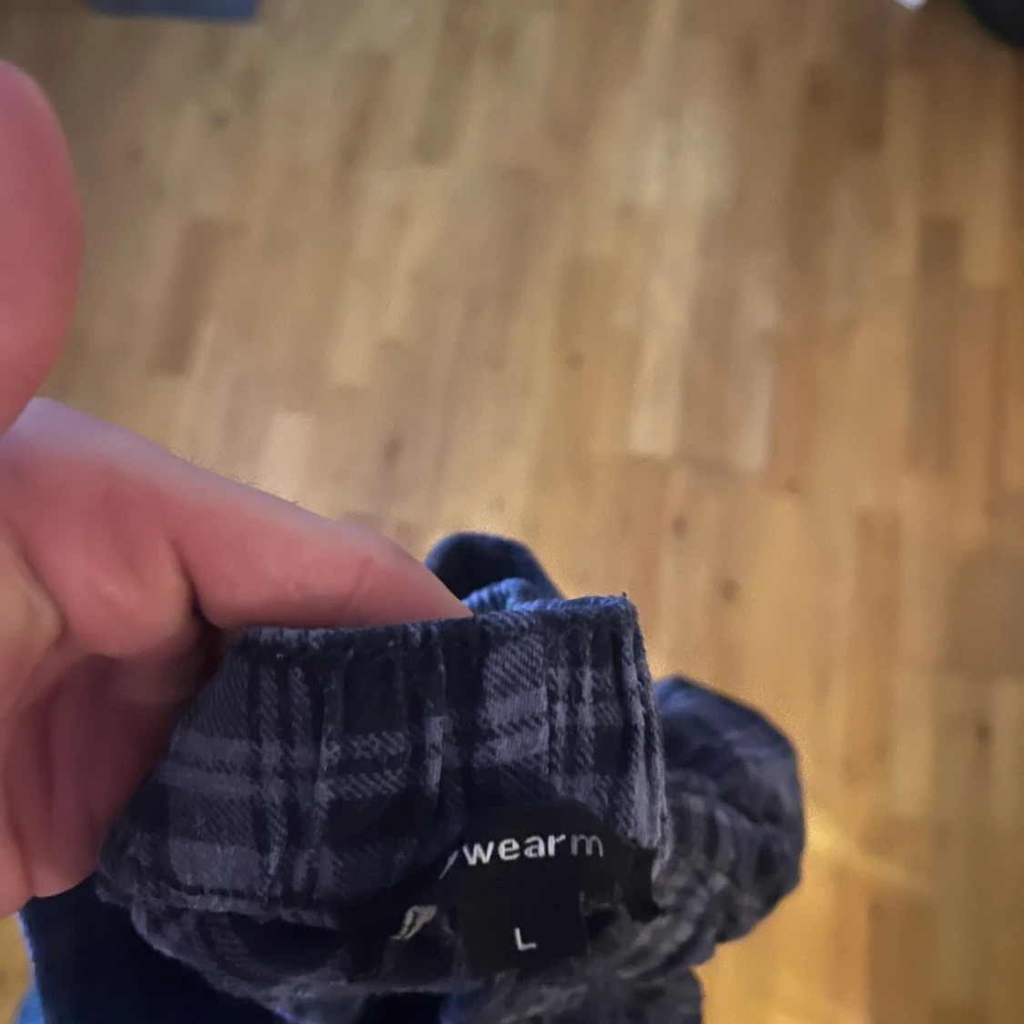 Blårutiga mjukisbyxor från Wear M i storlek L. Byxorna har elastisk midja och är gjorda i mjuk bomull, perfekta för chill dagar hemma. Mönstret är klassiskt rutig i mörkblå och grå toner.