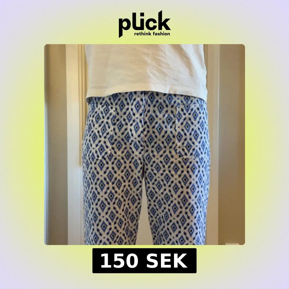 Säljer ett par chill blåvita linnebyxor med grafiskt diamantmönster. Byxorna har rak passform och midwaist, vilket gör dem sköna och luftiga.