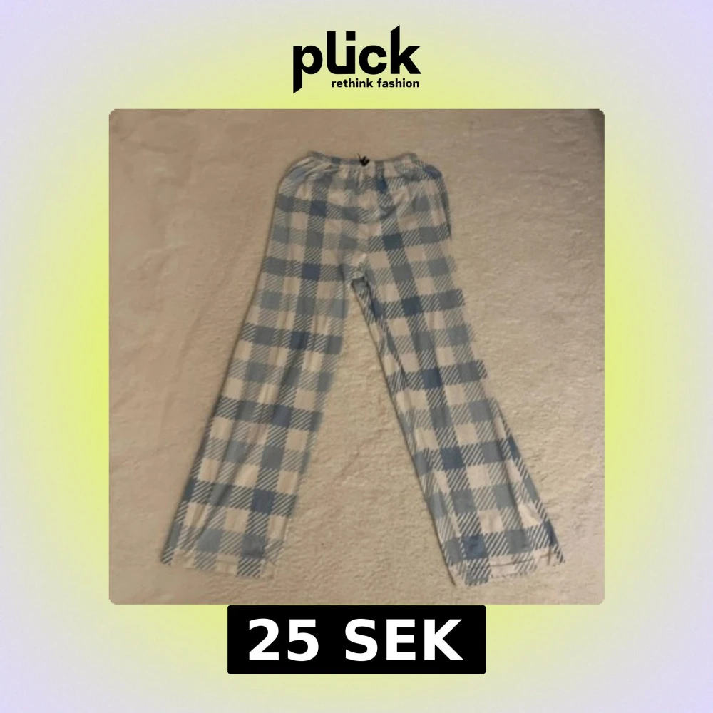 Säljer ett par mjukisbyxor med blåvitt rutigt mönster och resår i midjan. Byxorna har raka ben och är gjorda i mjukt bomullstyg, perfekta för chill dagar hemma. Snyggt och avslappnat vibe!