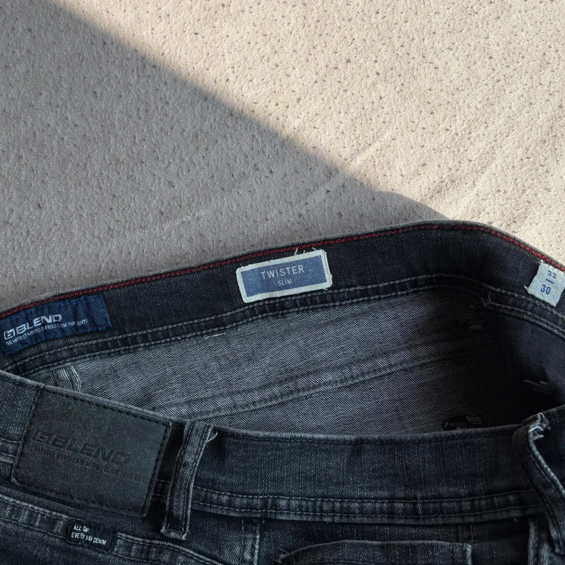 Säljer ett par svarta jeans från Blend, modell Twister Slim. Jeansen har fem fickor, klassisk knappgylf och en snygg tvättad look. Passformen är slim och materialet är mjukt denim som sitter skönt hela dagen.