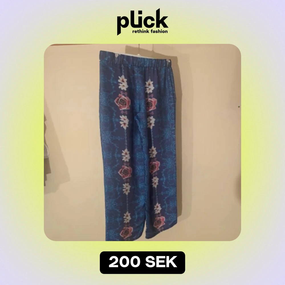 Ett par blå byxor med blommönster från Ida Sjöstedt för Monki. Byxorna har ett löst passform och är dekorerade med rosa och vita blommor.
