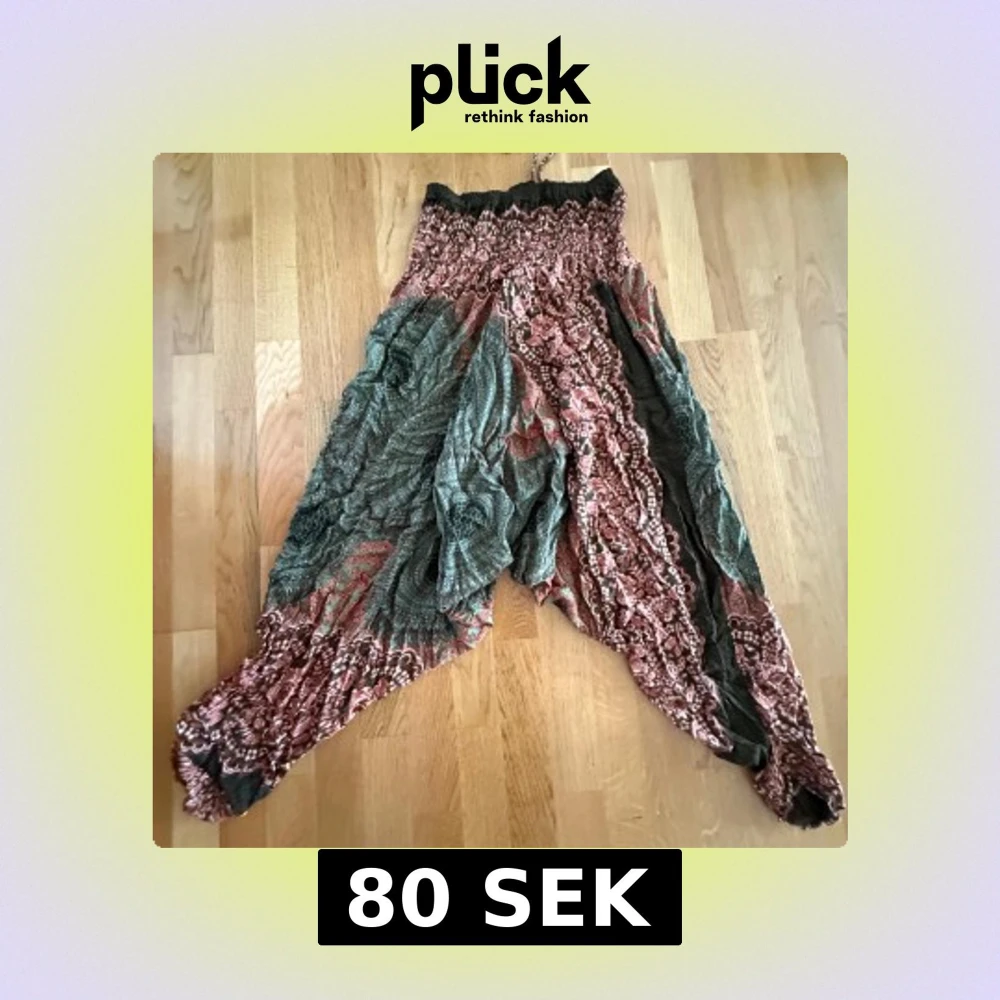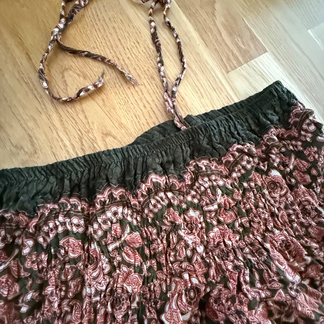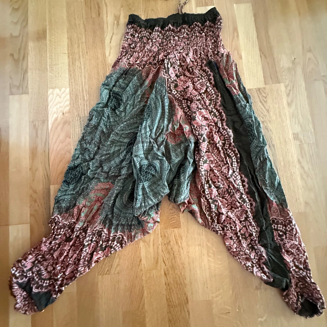 Säljer ett par superbekväma harembyxor med blommigt mönster i grönt och rosa. Byxorna har bred resår i midjan och vid benslut samt snörning upptill. Luftigt material, perfekt för varma dagar, yoga eller chill hemma. Unik boho-vibe och loose fit.